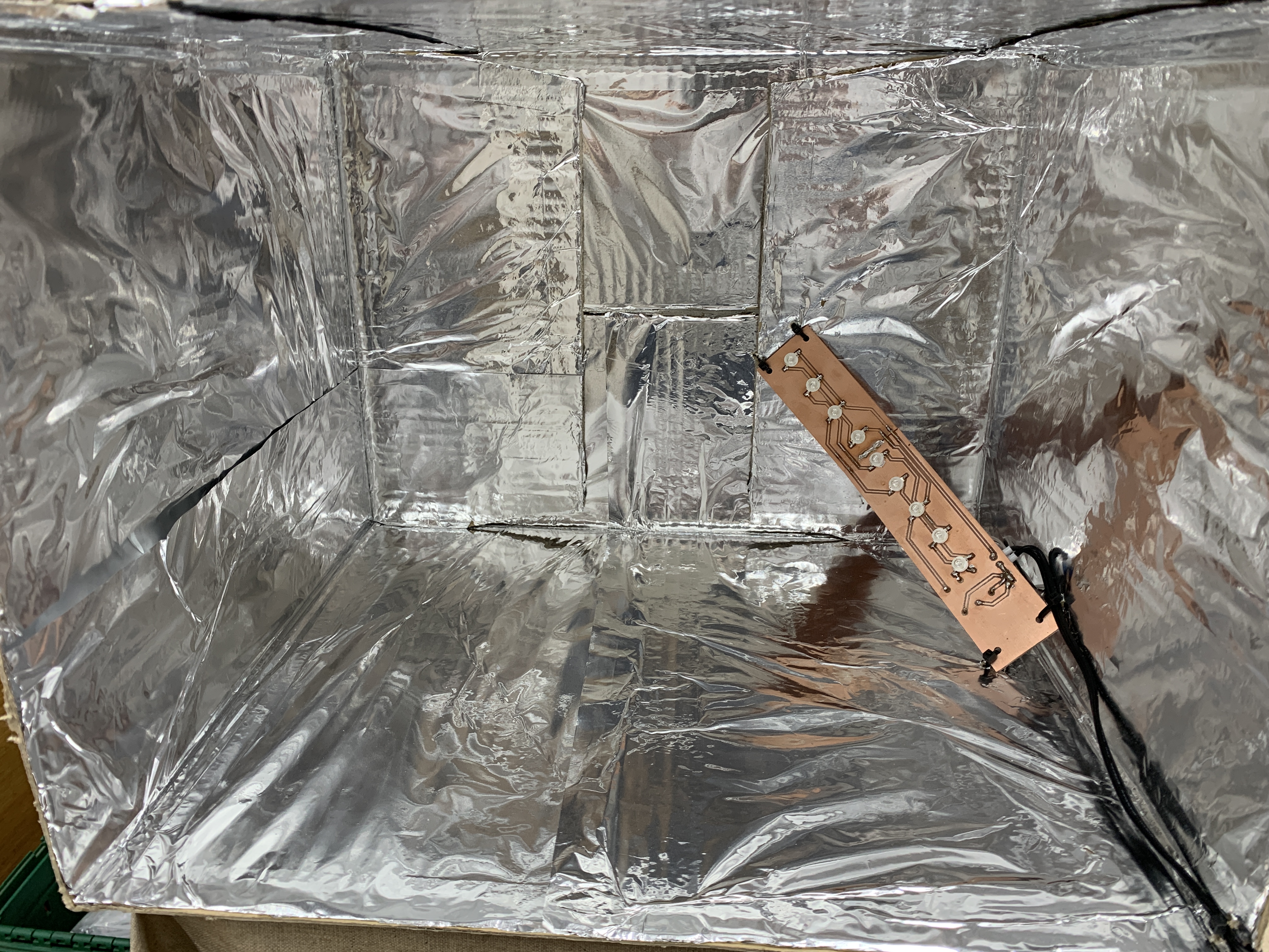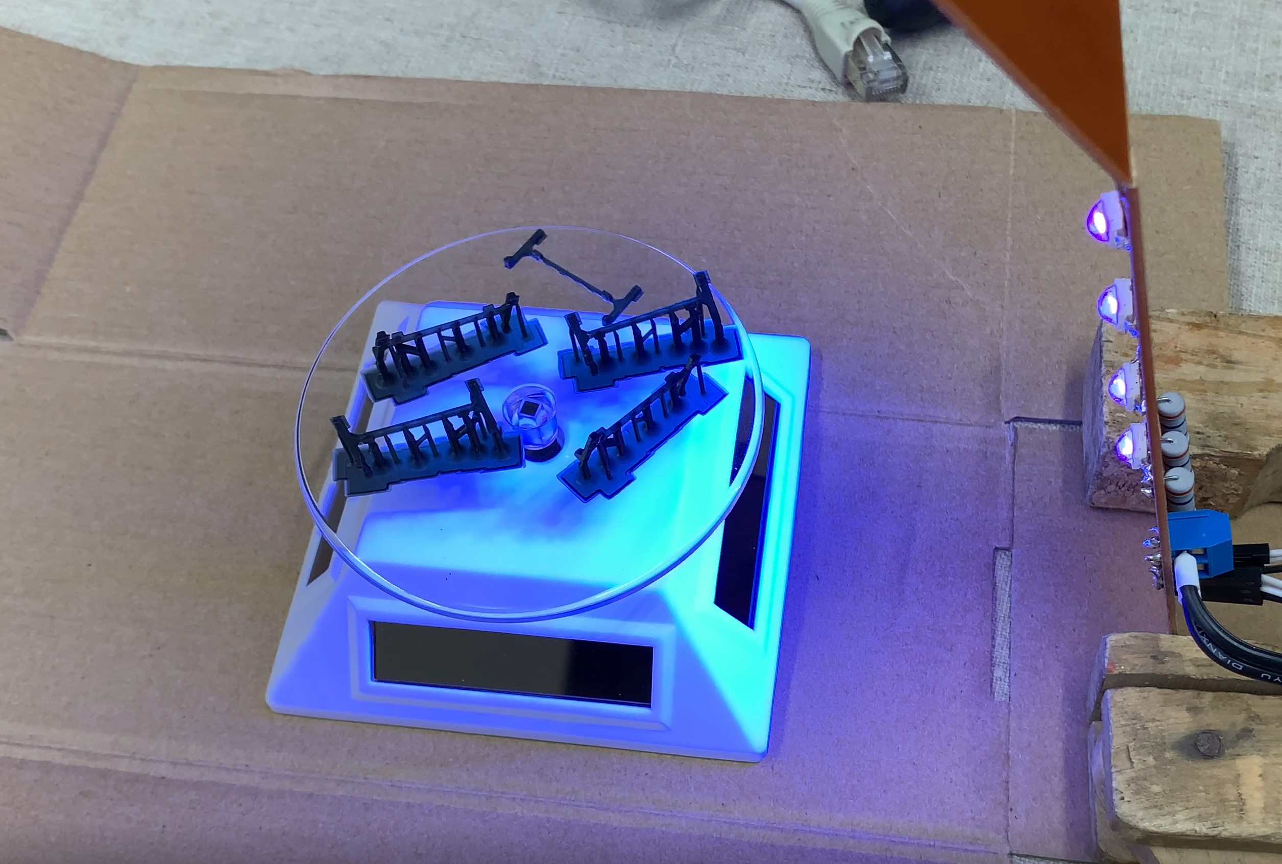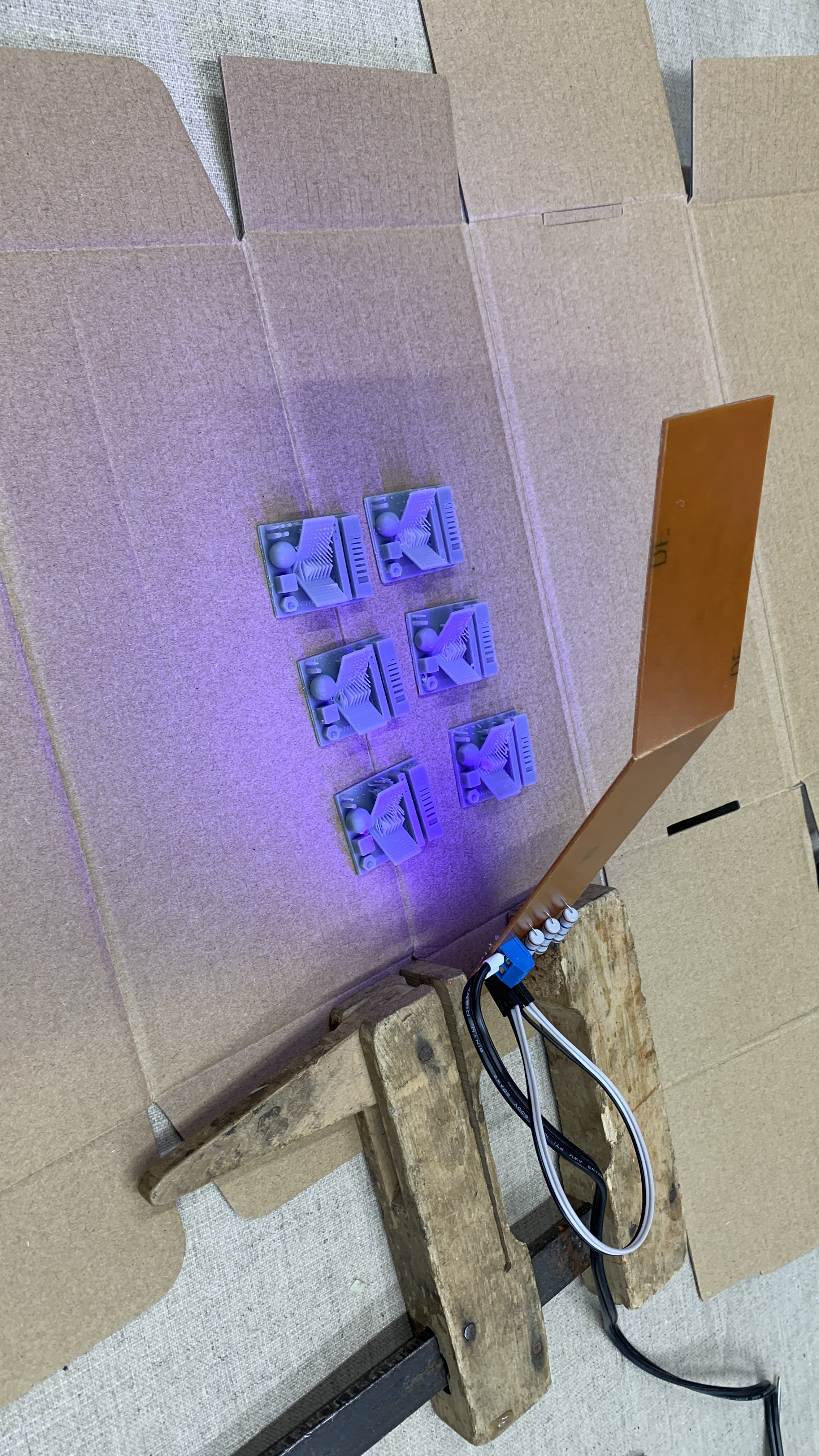 Einen Pappkarton innen mit Silberfolie tapezieren, ein "Präsenter" der sich dreht, ein paar UV-LED's (405nm), eine Zeitschaltuhr und ein Netzteil und ein Streifen Platine …