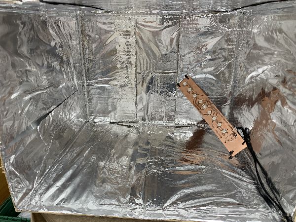 So sieht der Karto nun von innen aus. Die Platine mit den 10 LED's á 3W habe ich mit Kabelbindern befestigt. Mal schauen, wie lange die den UV-Beschuß standthalten …