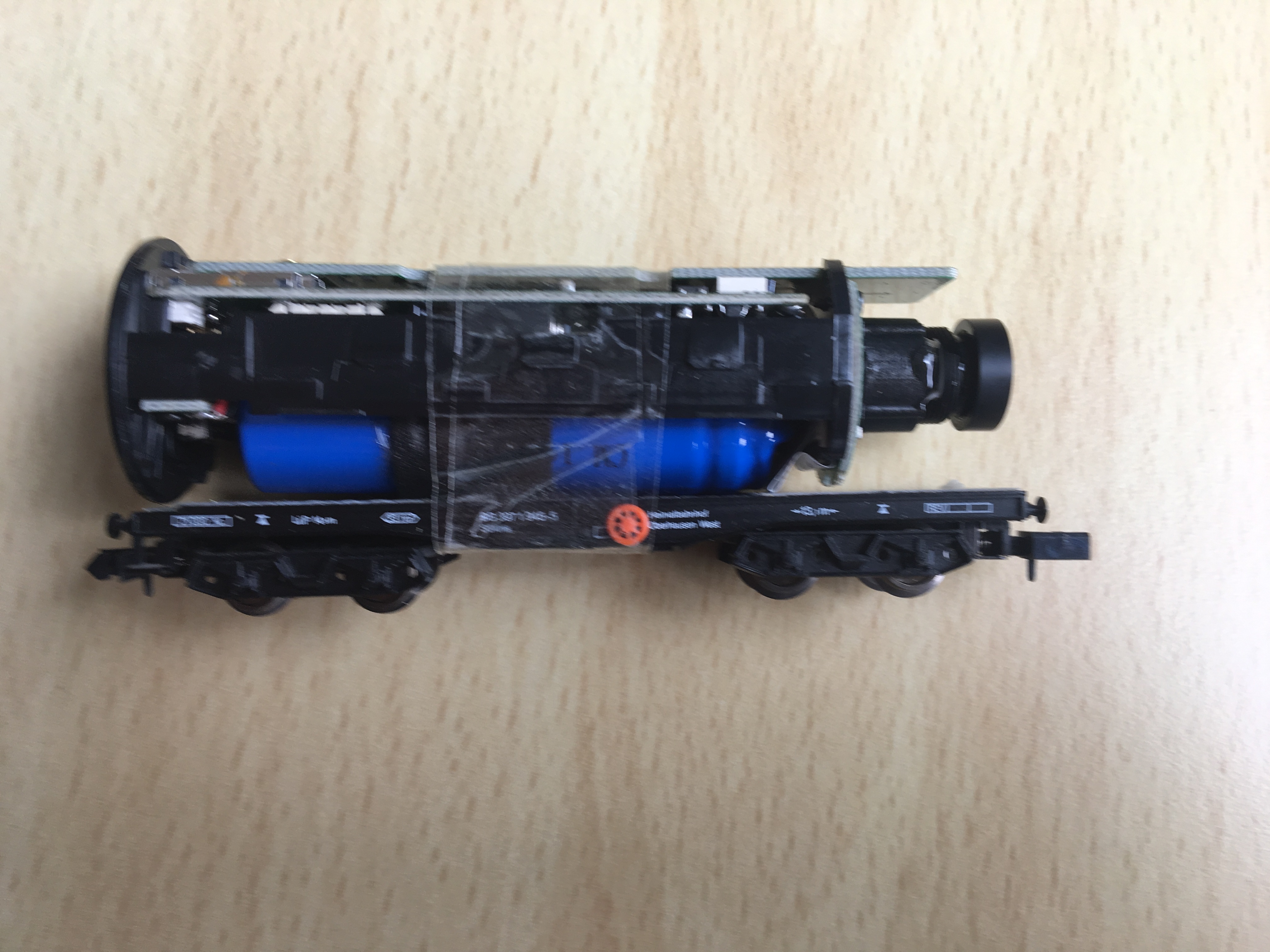 Bisher ist die Kamera nur provisorisch am Flachwagen befestigt, das werde ich noch weiter verbessern. In diesem Zug werde ich den Wagen noch in das NEM-Lichtraumprofil für N anpassen.