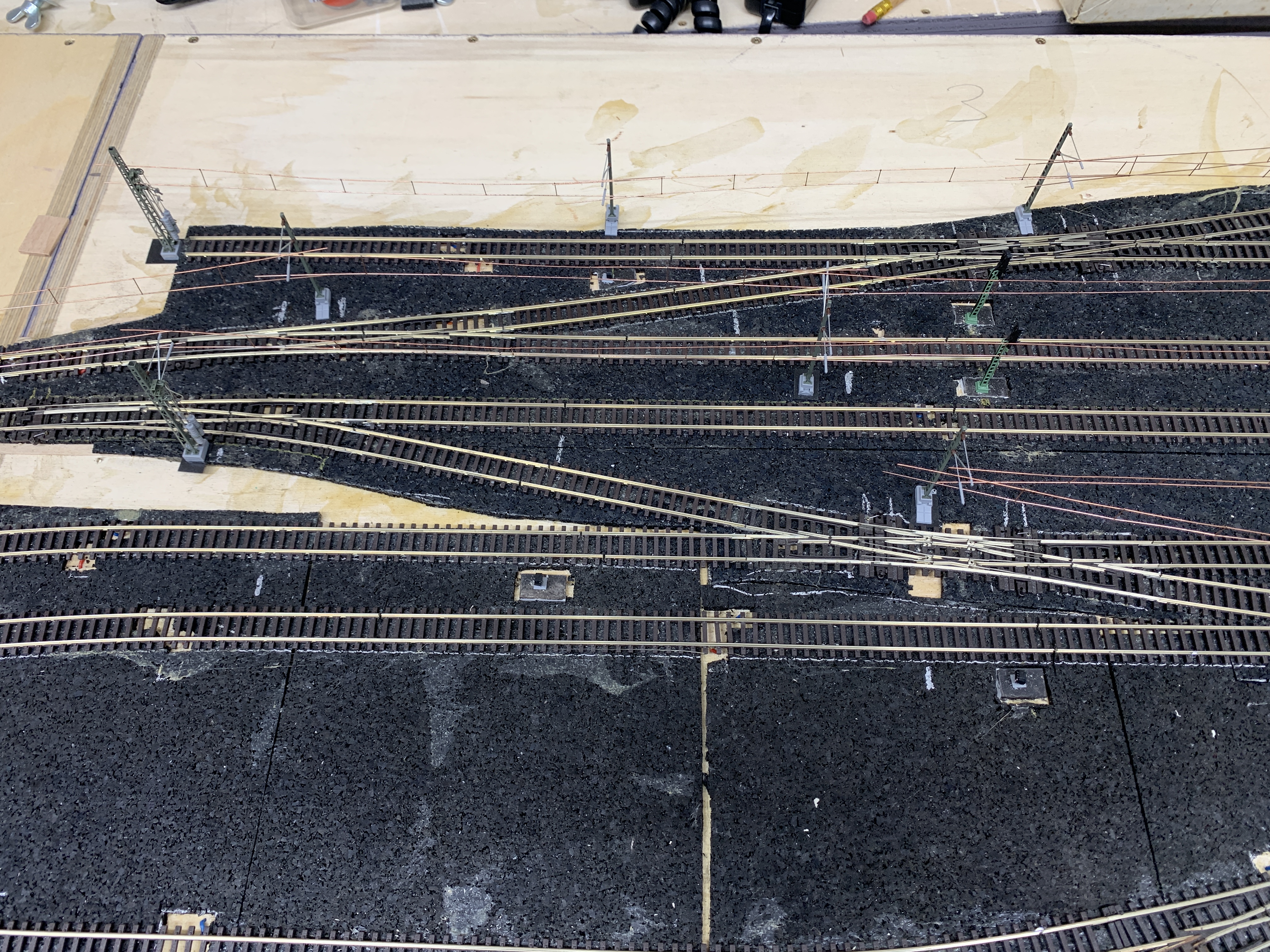 Hier habe ich 250mm und 200mm Profi-Fahrdraht von Sommerfeldt (0,4mm Fahrdraht und 0,35mm Tragseil) mal so grob eingelegt. Die Position der Masten passt schon so, aber dann fehlen mir eben Fahrdrähte bis 350mm Länge.