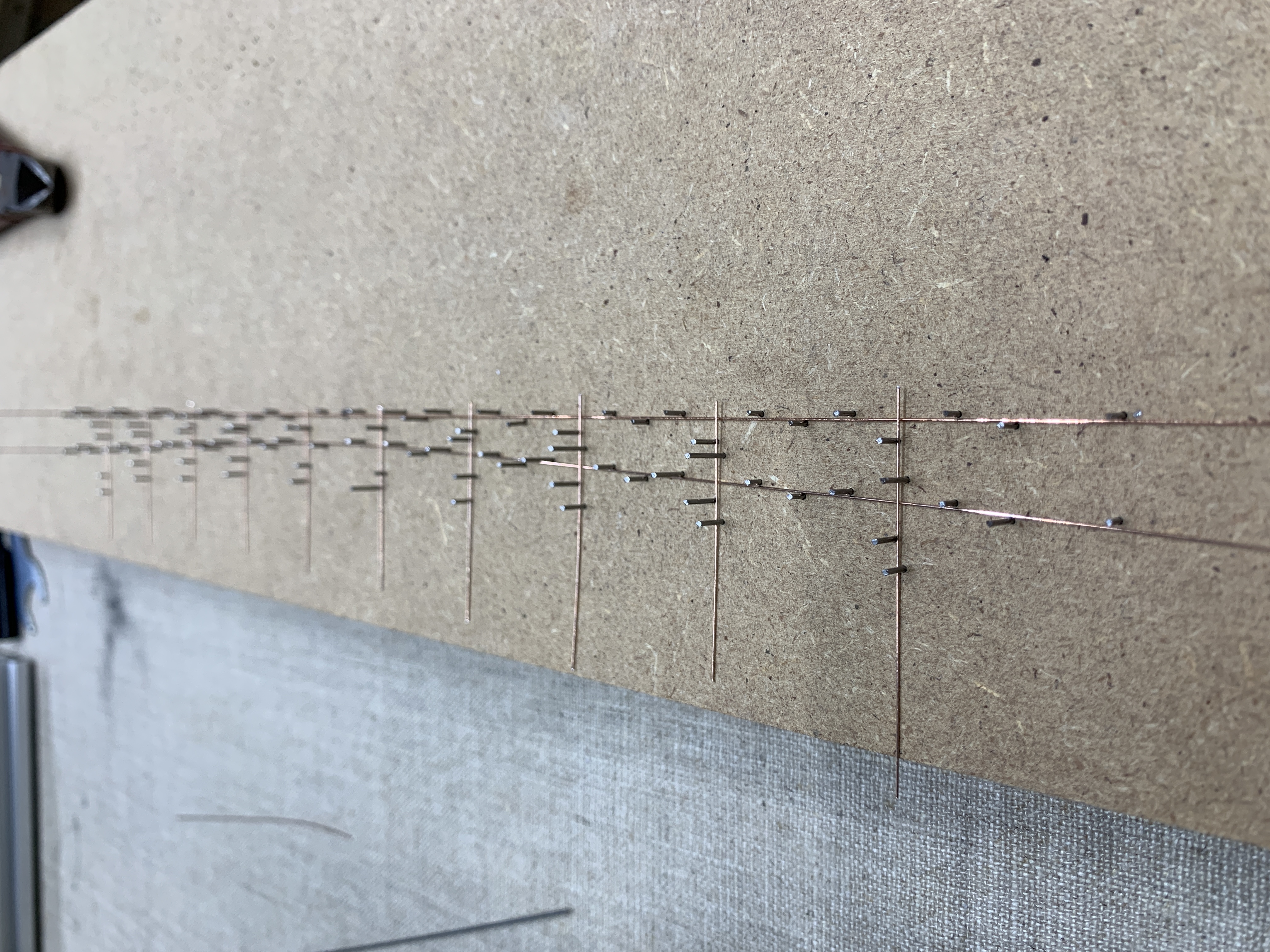 Entscheidend ist die Verbindund von Tragseil, Abhängeseil und Fahrdraht. Um die einzelnen Drähte und Seile zu positionieren, werde ich dazu ein Legebrett machen. Ich brauche ja so 30 Fahrdrähte, da lohnt sich das, wenn sie dann auch alle gleich werden sollen.