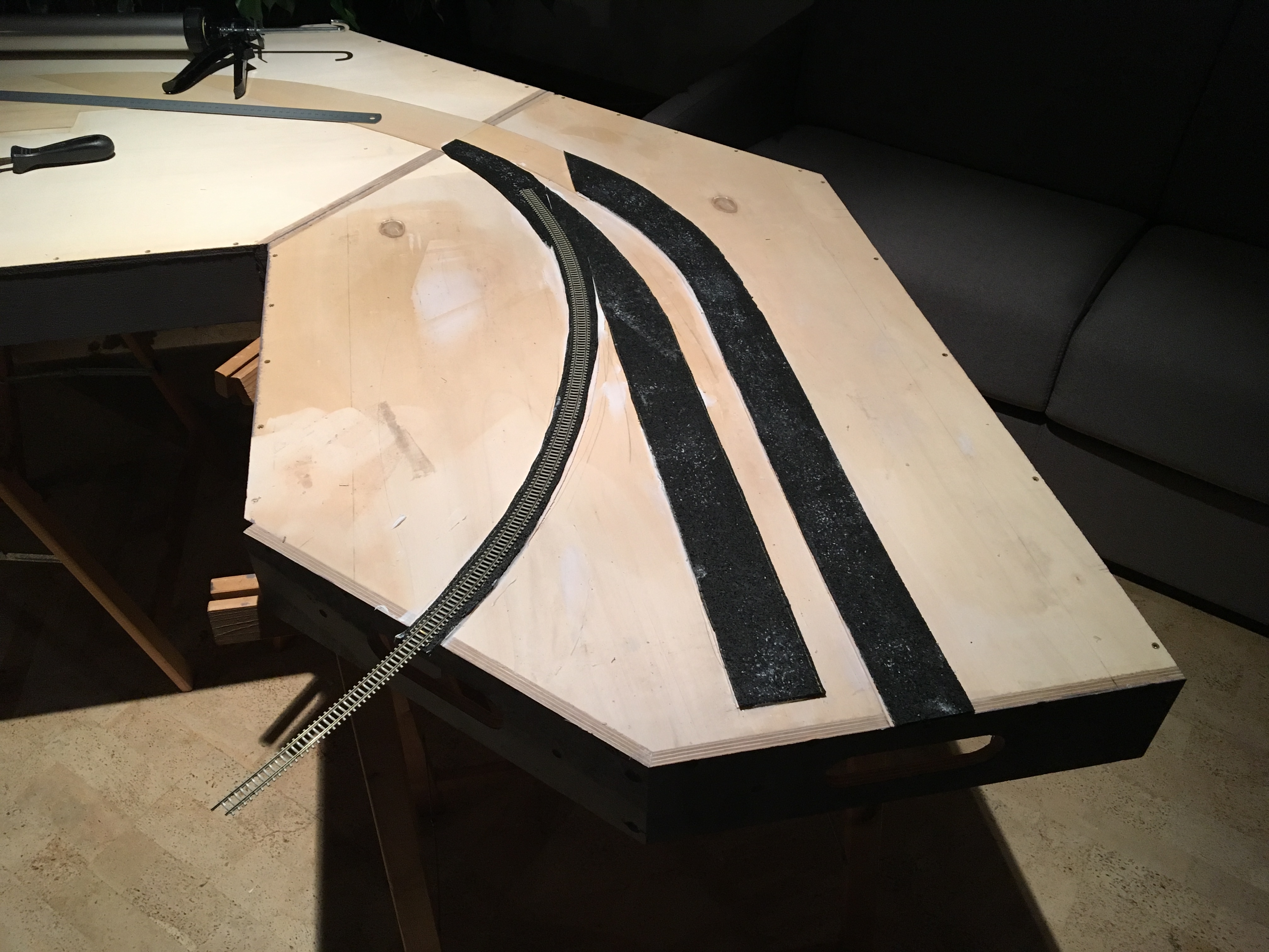 Auf dem Modul wird dann ein entsprechender Gleisunterbau erstellt. Um die Modul-Norm des FREMO zu erfüllen, muß das Gleis auf einer bestimmten Höhe zur Modulkante sein, damit es sich später ohne Übergänge an andere Module anfügen läßt. Bei zweigleisigen Modulen ist auch der Gleisabstand festgelegt.