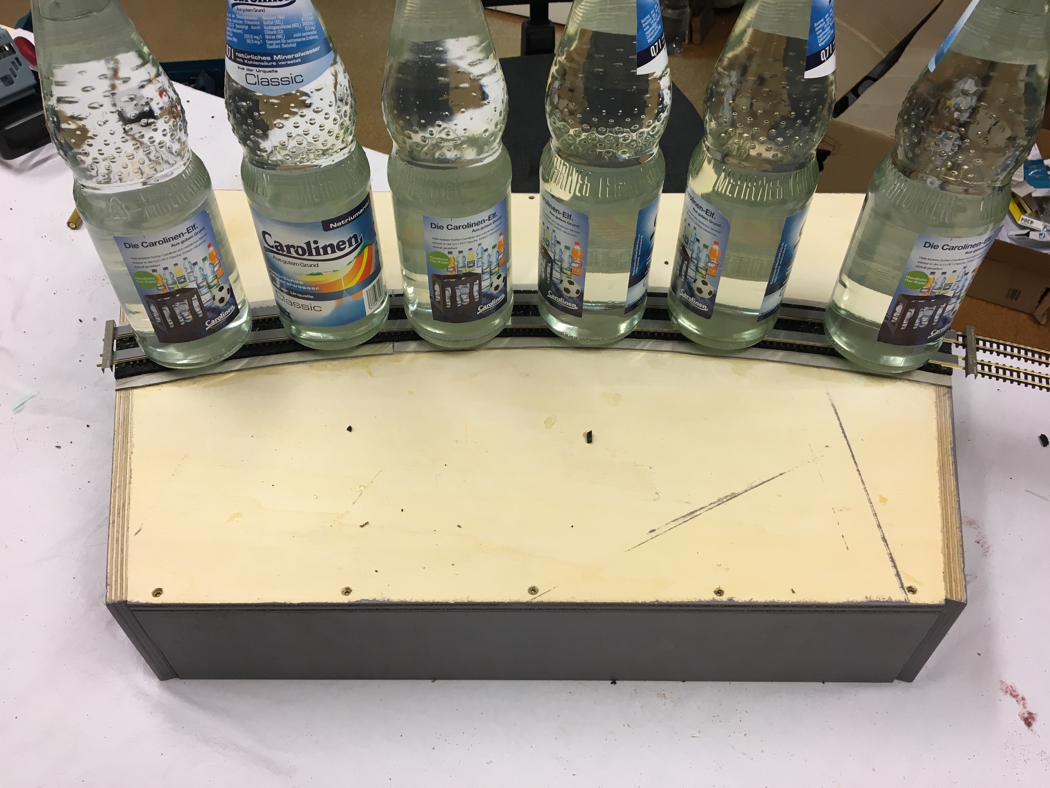 Was aber auf jeden Fall immer eine echte Hilfe ist, ist eine Gleisabstandslehre. Ich habe welche von N-Detail eingesetzt, die haben mehrere "Kerben" für unterschiedliche Gleisabstände. Auch für das Verlegen von Flexgleisen ist es sehr hilfreich, wenn man entsprechende Gleisklemmen verwendet, dann bleibt das in den erforderlichen Radius gedrückte Gleis besser in seiner Form.