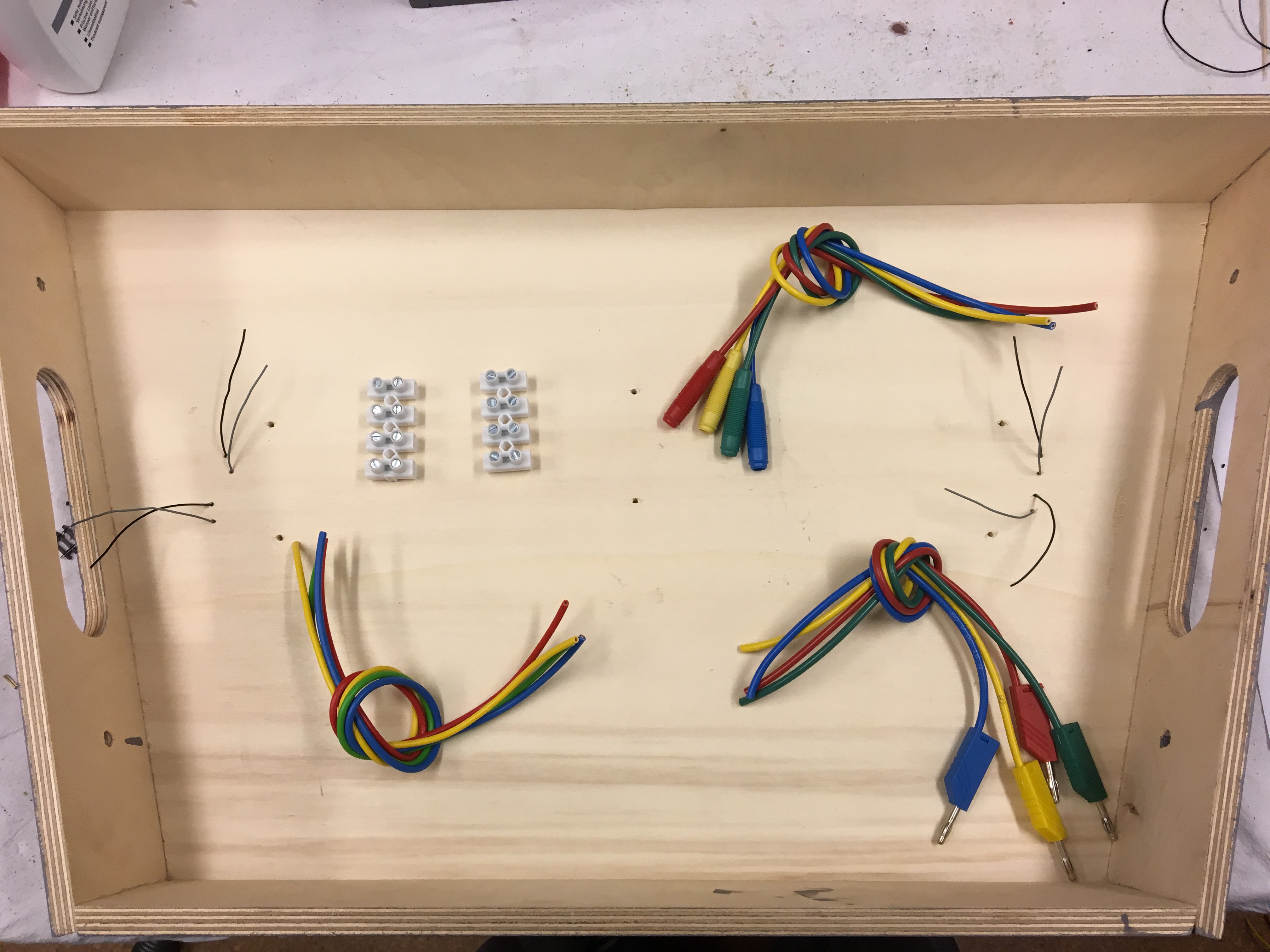 An den Gleisanschlüssen (dünner Draht) wird dann die Einspeiseleitung angeschlossen. Beim Fremo muß jedes Gleis, bei zweigleisigen Modulen jedes Separat, mit Strom versorgt werden. Auch welche Schiene eine Buchse oder einen Stecker bekommt, damit es zum Nachbarmodul kompatibel ist, ist in der Norm festgelegt.