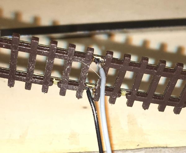 Eine sichere Stromeinspeisung, die am besten noch "unsichtbar" ist, ist für den Spielbetrieb erforderlich. Hier sind die Einspeisestellen unter das Gleis gelötet (Peco Code55 Flexgleis).