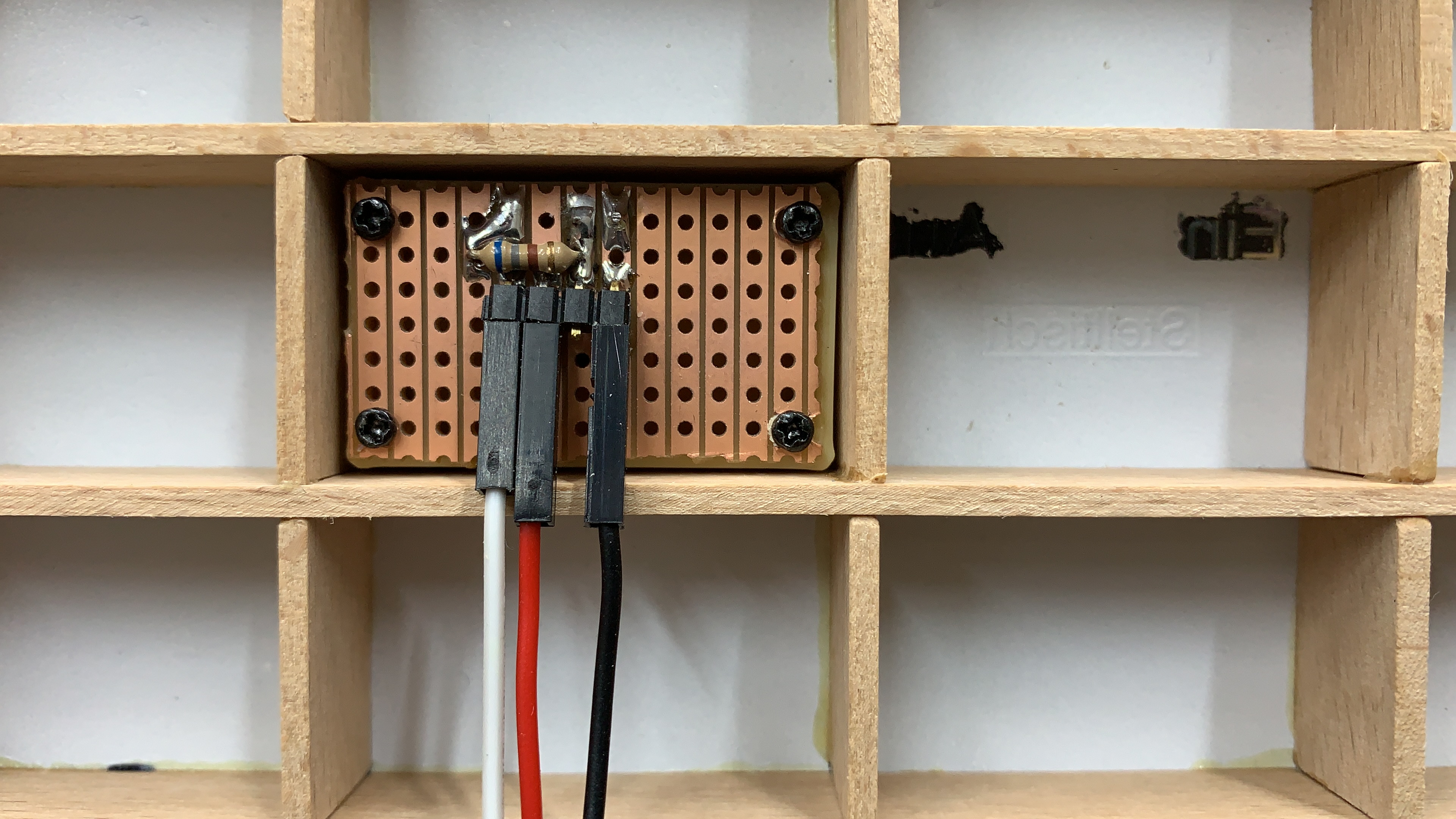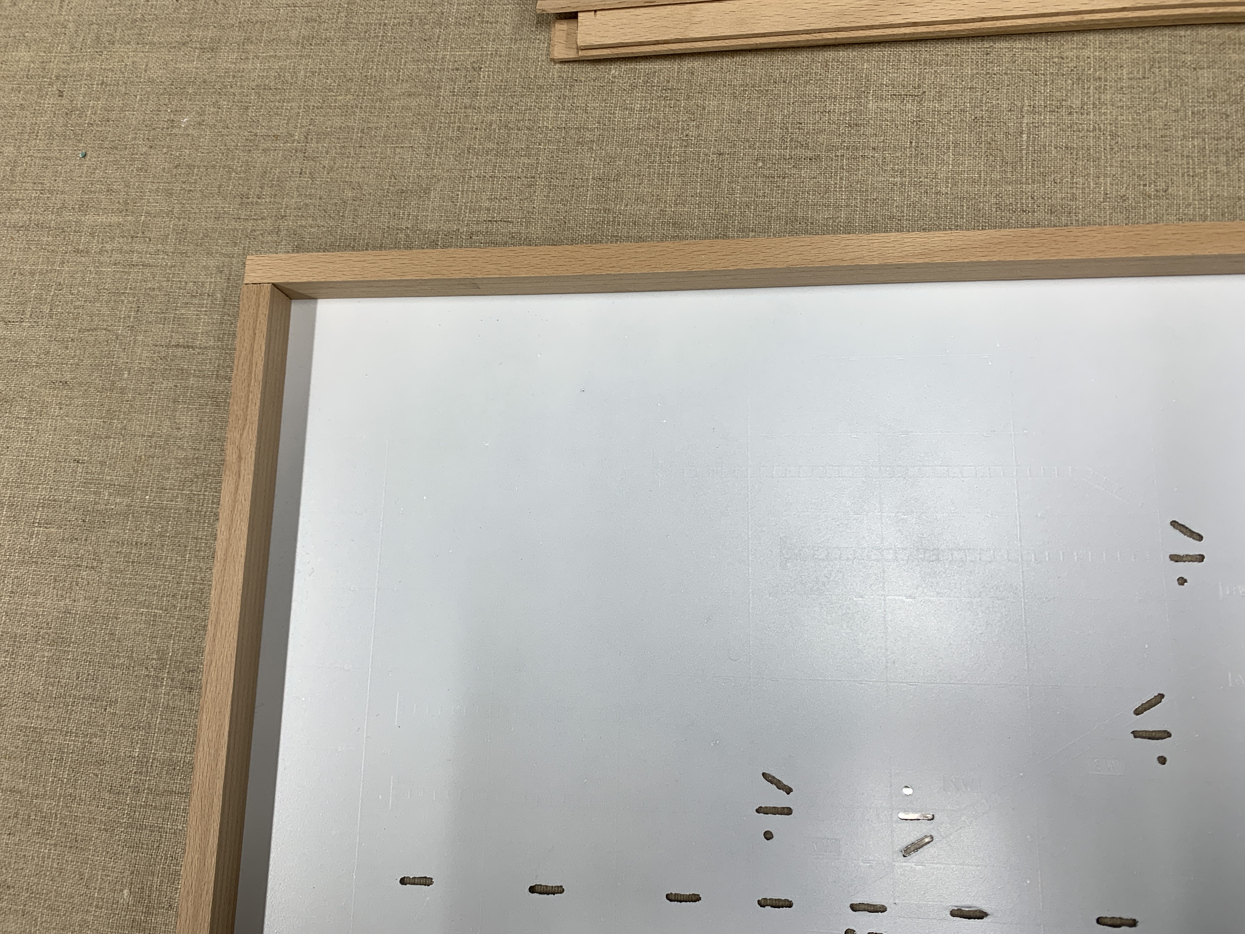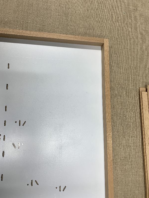 Danach wollte ich einen Holzrahmen und Einteilungen einkleben. Das hat auch ganz gut geklappt, leider habe ich mir Markierungen mit Filz-Stift auf der Innenseite gemacht, die nun auf der anderen Seite sichtbar sind