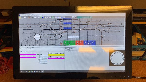 Auf diesem 27"-Touch-Monitor läuft neben der Stellpultsoftware noch RgZm und die Uhr. Die Bedienung des Stellpultes ist mit einer Start-Ziel-Eingabe zu bedienen, wie beim Vorbild. Ist die Ausleuchtung entsprechend eng mit Belegtmeldern durchgeführt, dann ist es seinem mechanischen Vorbild schon sehr nahe.