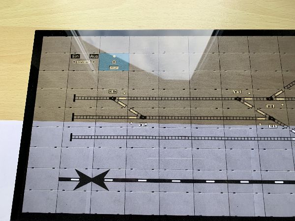 Bei kleinen Stellpulten wie z.B. der Zeche muß es nicht ganz so aufwändig sein. Ich habe mir für das defekte Stellpult der Zeche eines auf 3mm PVS-Hartschaum drucken lassen