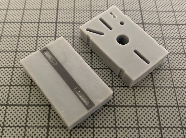 Die sind zwei Exemplare aus dem 3D-Druck, rechts das mit der maximalen Bestückung (Weiche mit Verschluß), links minimal (Strecken-Segment).