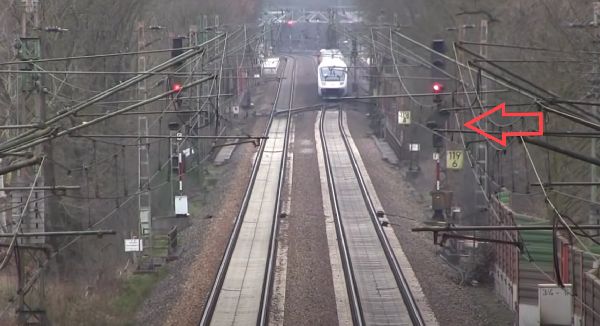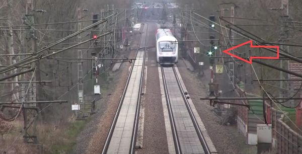 Wenn der Zug am Signal vorbei ist, fällt das Hauptsignal auf Hp0 und kurz danach erlischt das Vorsignal am gleichen Mast.