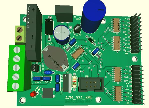 Da ich für meinen Bahnhof Elisburg entsprechende Signal-Anzeiger an den Modulrahmen befestigen möchte (das Zugpersonal kann wegen der vielen Gebäude etc. nicht immer alle Signale am Gleis sehen) habe ich einen entsprechenden SX-Lichtdecoder für 4 Adressen (32 LED's) mit SMD-Bauteilen neu geroutet.