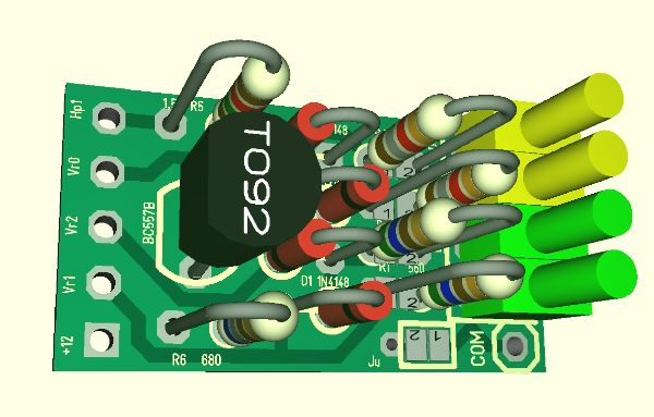 Ich habe eine kleine Platine entwickelt, die nur 3 Eingänge für Vr0, Vr1 und Vr2 hat sowie Hp1 und +12V. Die Vorwiderstände für die LED's können durch entsprechende Lötjumper gebrückt werden und wenn ich keine Dunkelschaltung benötige kann ich auch den Transistor mit seinen Widerständen weglassen und +12V mit einem Jumper überbrücken.