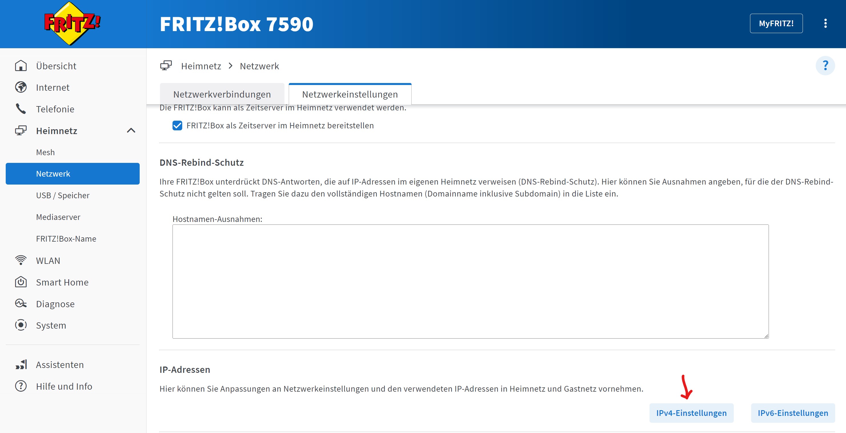 Zunächst muß geprüft/eingestellt werden, dass die Fritz!Box als DHCP-Server eingestellt ist. Dazu im linken Bereich "Heimnetz - Netzwerk" auswählen, im sich dann öffnenenden Fenster oben "Netzwerkeinstellungen" auswählen, nach ganz unten scrollen und dort "weitere Einstellungen" anklicken, dann wieder nach ganz unten scrollen und "IPv4-Adressen" anklicken