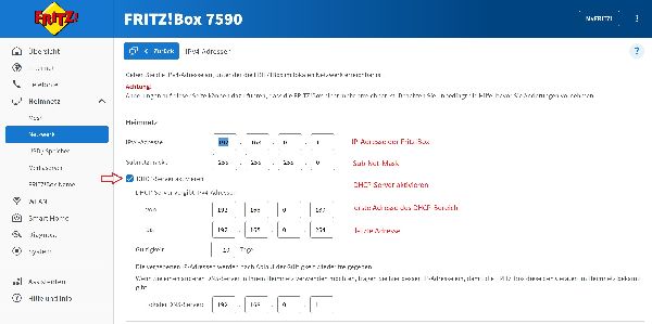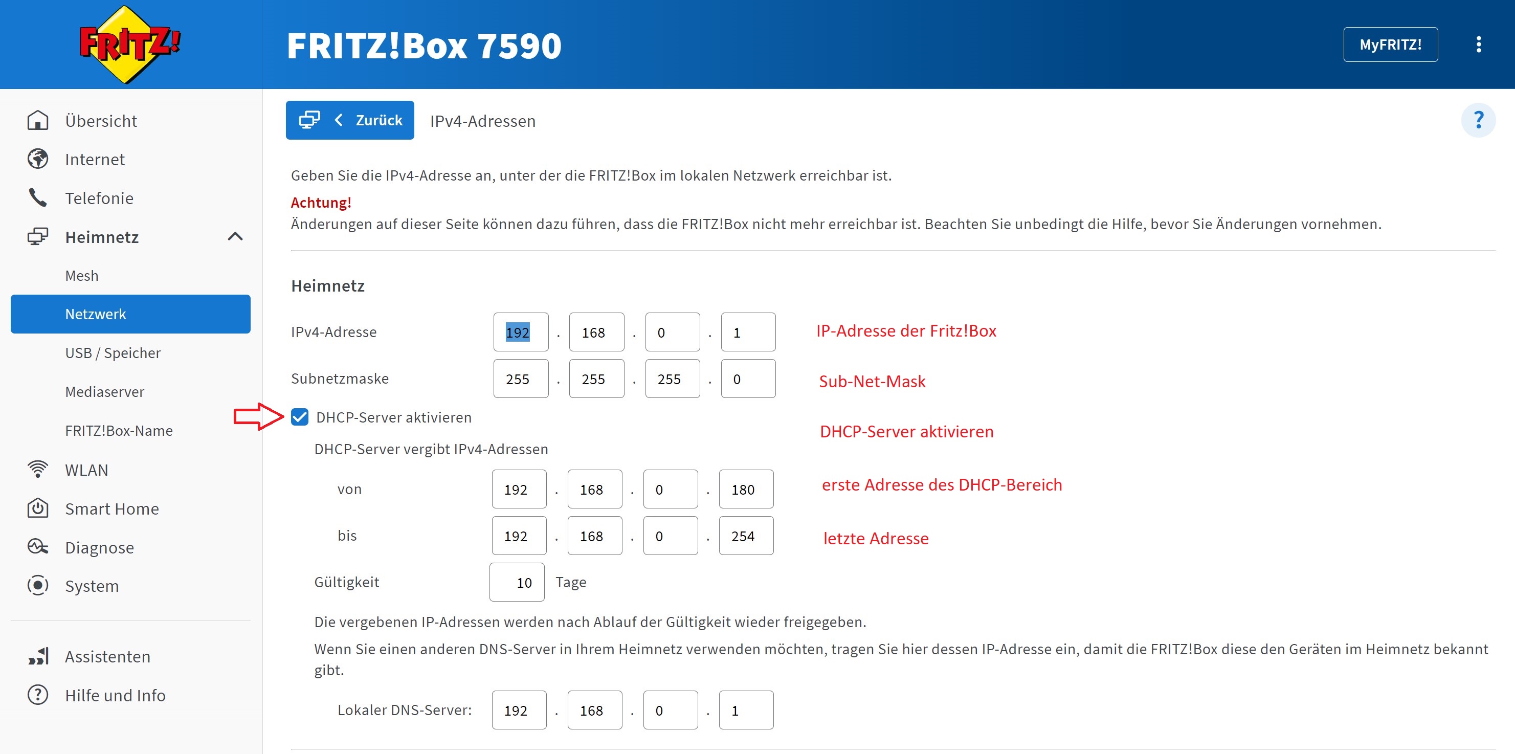 Wenn die Fritz!Box bereits als DHCP-Server läuft, dann ist hier nichts zu verändern, die dort angegebenen IP-Adressen werden später benötigt, also merken/notieren.