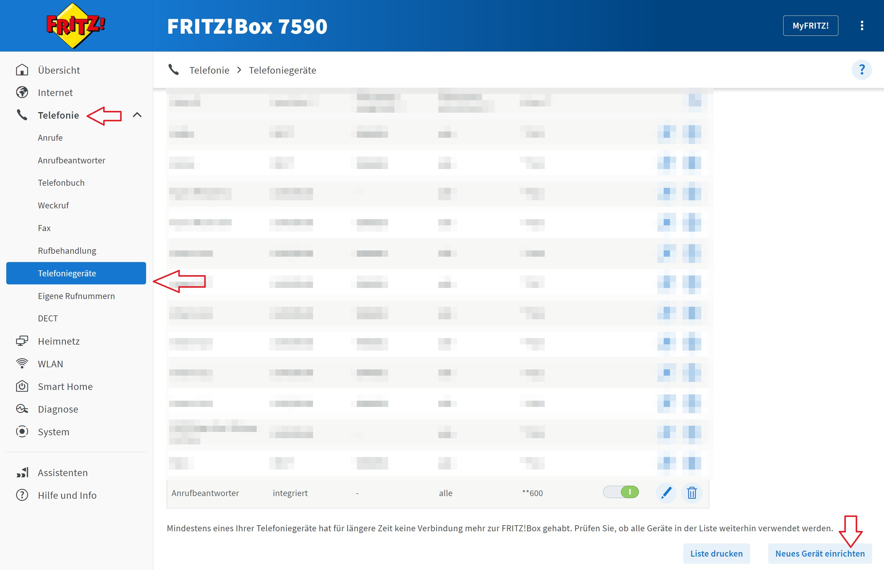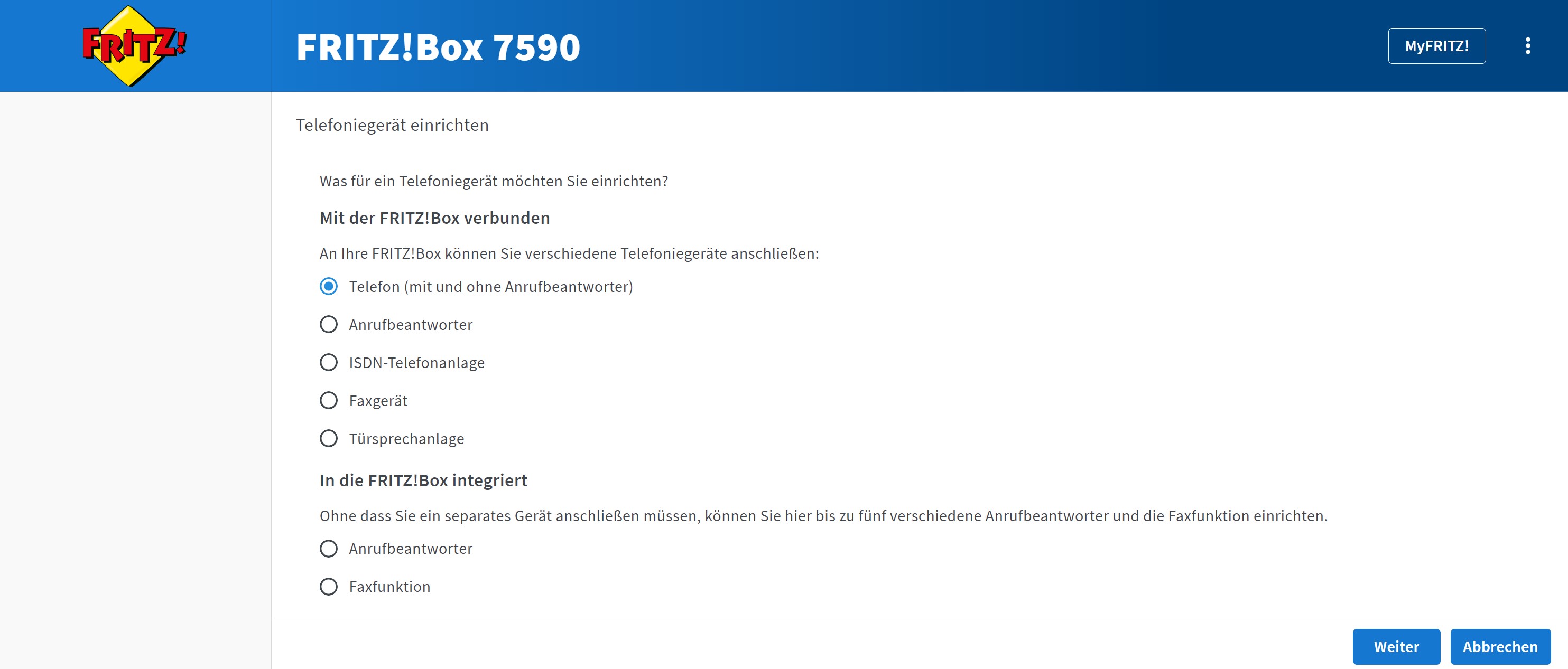 Hierzu links "Telefonie - Telefoniegeräte" auswählen und unten "neues Gerät einrichten" anklicken, dies führt zum Fritz!Box-Assisten