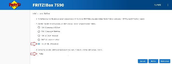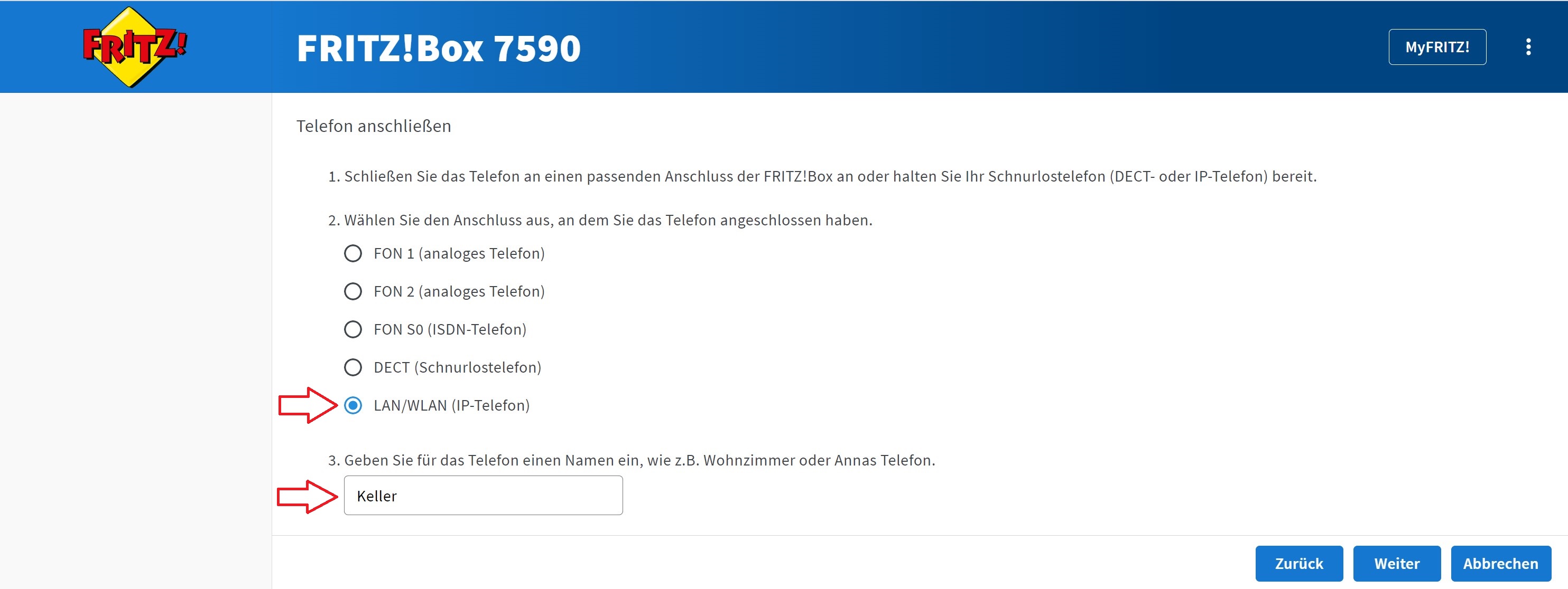 Nach drücken auf Weiter muß der Anschluß an der Fritz!Box für das Telefon ausgewählt werden und der Anzeigename wird eingegeben.