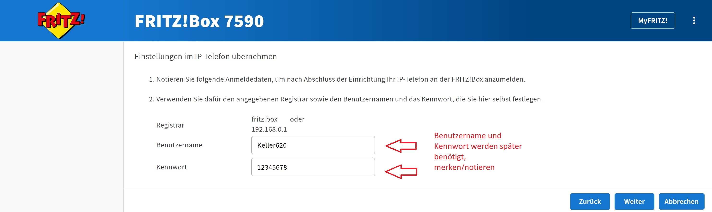 Im nächsten Fenster wird der Anmeldename und das Kennwort vergeben, diese beiden Eingaben müssen später in der cnf-Datei angegeben werden, sonst kann sich das Telefon nicht an der Fritz!Box anmelden.