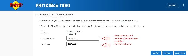 Der hier verwendete Benutzername muß nach den Anforderungen der Fritz!Box vergeben werden, es gibt eine erforderliche Anzahl an Buchstaben/Zeichen und es gibt unerlaubte Zeichen. Die Hinweise der Fritz!Box beachten, wenn der vergebene Name nicht akzeptiert wird.