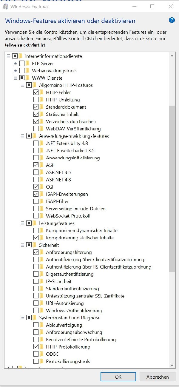 2) Auf einem am gleichen Netzwerk betriebener PC muß der Internet Information Service (IIS) gestartet werden (Microsoft-Dienst, wird mit WIN10 vorinstalliert). Dazu auf dem Windows-Rechner in der Suche "Windows-Features aktivieren" eingeben und ausführen. Es wird ein Fenster mit allen Features, die auf diesem Computer aktiviert sind, aufgebaut.
