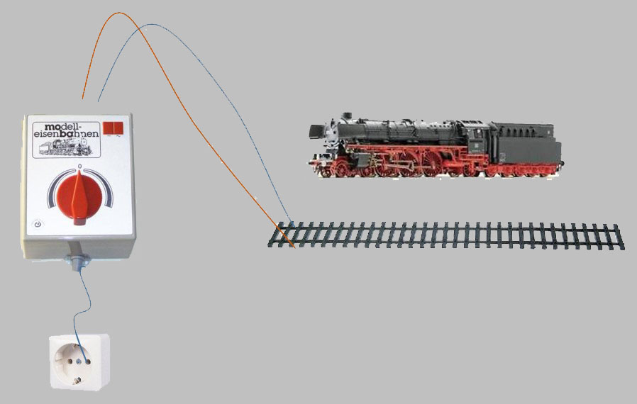 Der Trafo setzt den Netzstrom von 230V in 12V um, mit dem Drehregler kann nun von 0 - 12V Strom auf das Gleis gegeben, ggf. kann der Drehregler am Trafo auch umpolen, so kann die Lok vorwärts und rückwärts fahren