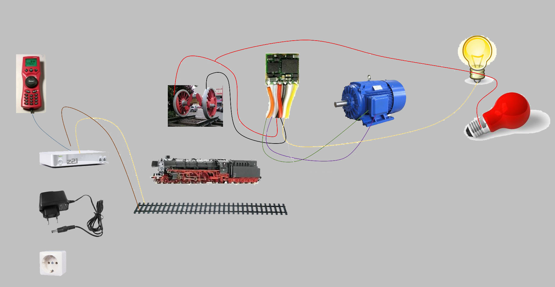 Zunächst braucht jede Lok einen Dekoder. Das ist ein elektronisches Bauteil, welches entscheided, ob die Informationen aus dem Gleis für diese Lok bestimmt sind.