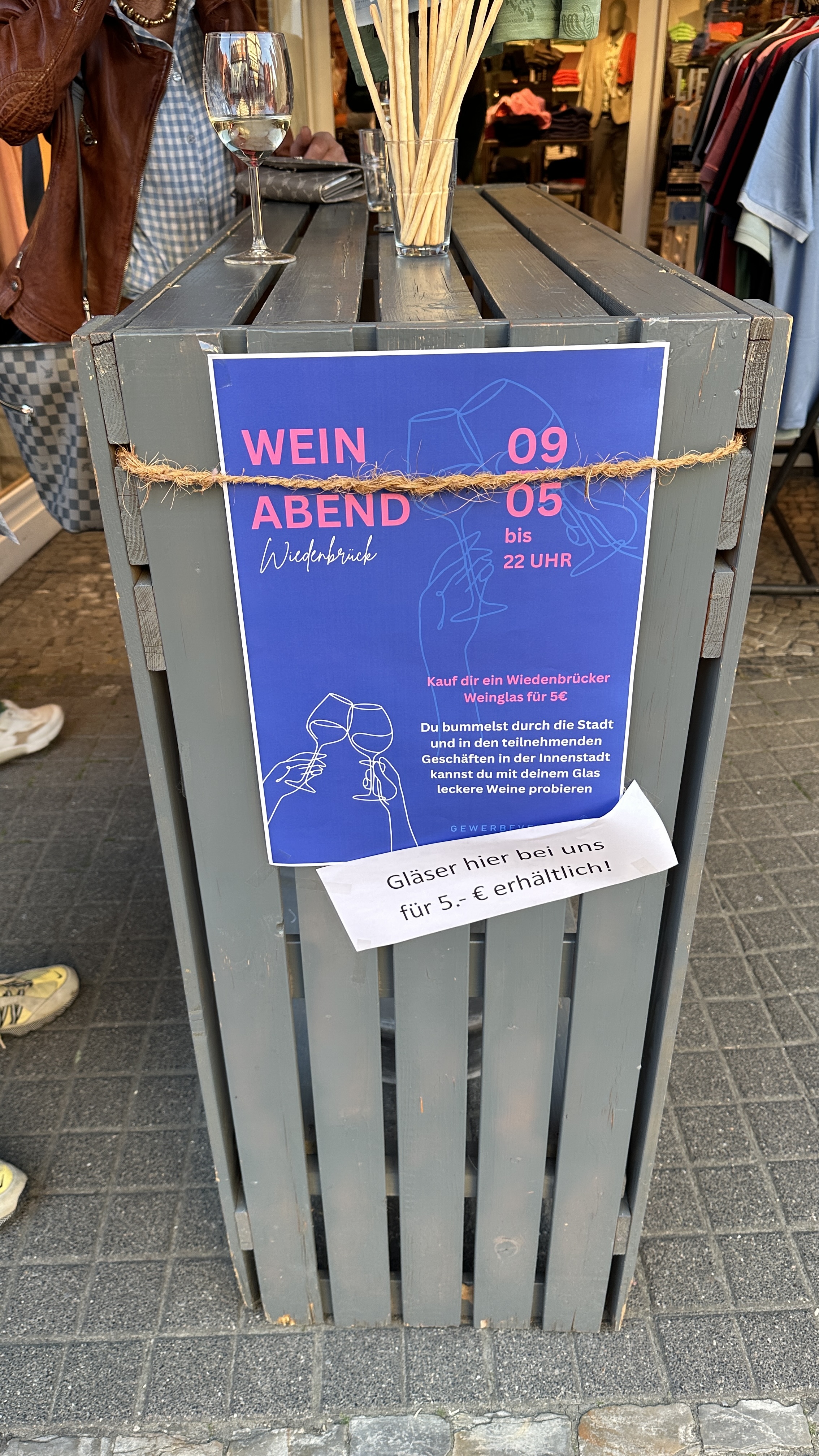 Das war eine ganz spontane Tour in den Nachbarort Rheda. Dort wurde (W)Einkaufen angeboten. Das bedeuet, im ersten Geschäft kauft man ein Weinglas und in allen weiteren beteiligten Geschäften wird das Glas aufgefüllt …