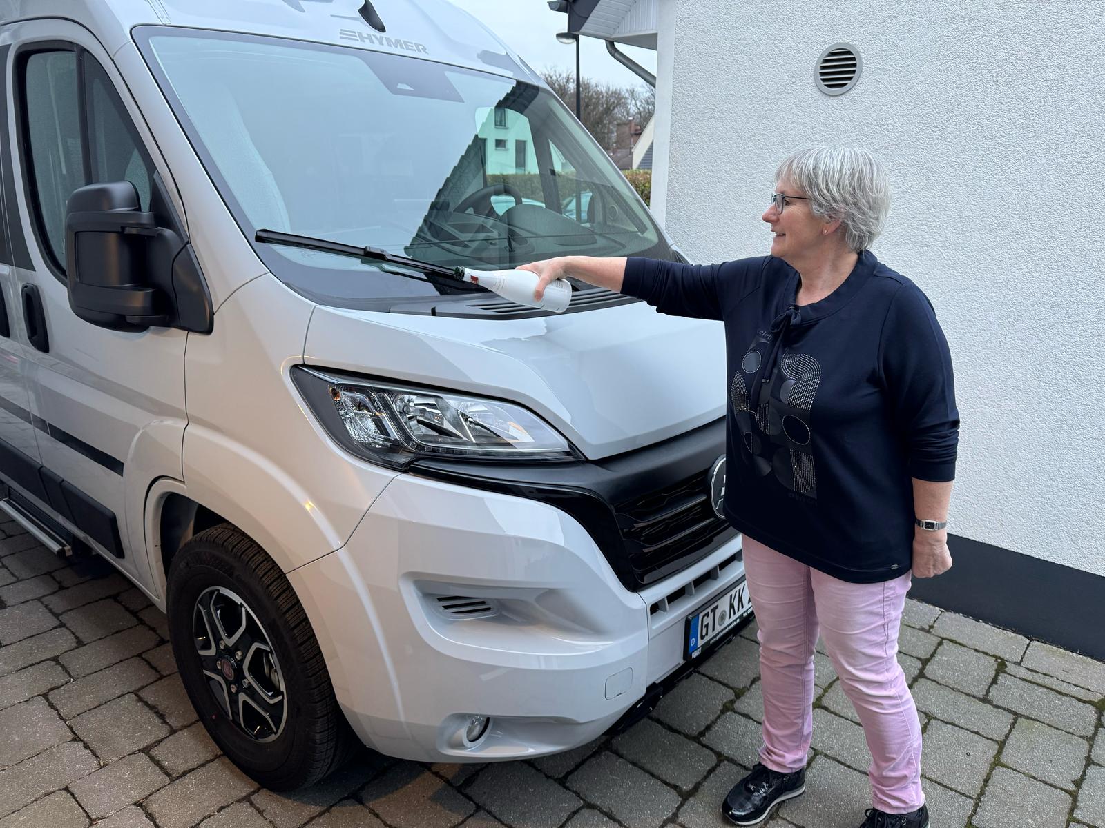 Beim Hymer ist die Gasflasche nur von hinten durch die linke Hecktür erreichbar. Vor dem Schrank stehen noch die Stühle, also einfach zu erreichen geht nicht.