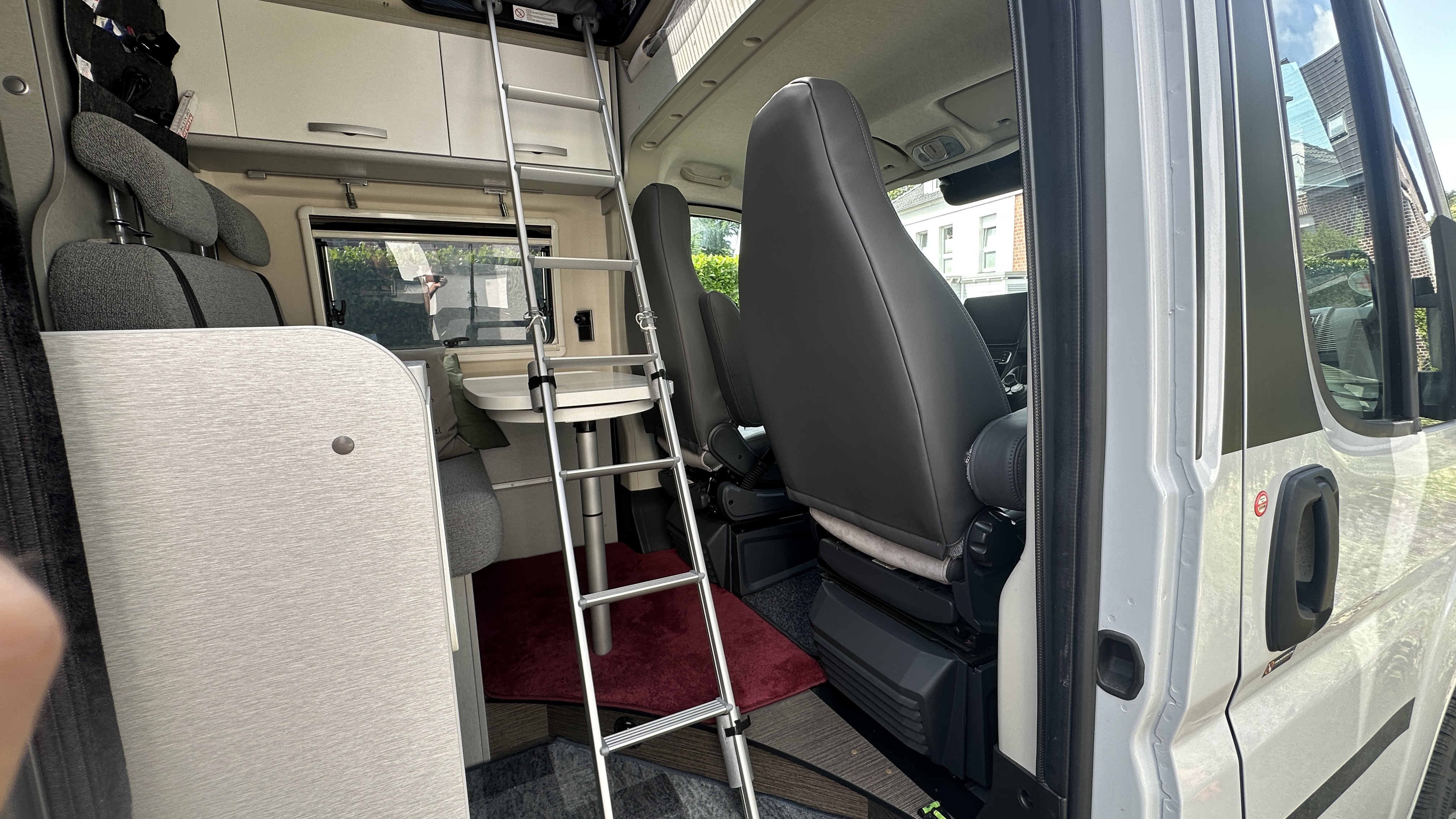 So kann die Leiter stehen bleinben, man kann noch am Tisch sitzen (Fahrersitz gedreht), ideal …