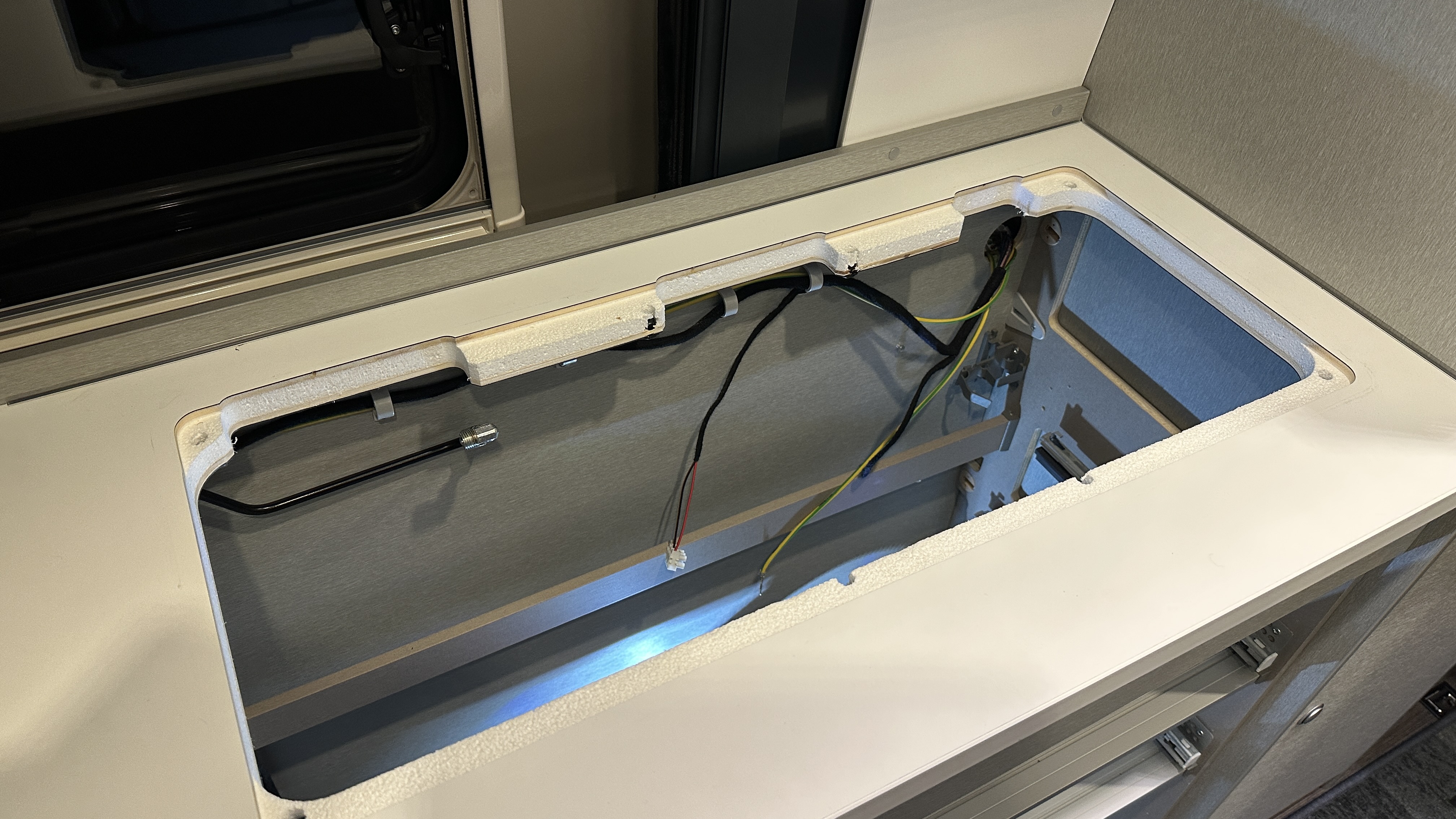 Loch in die Rückwand schneiden, am Mückenschutz-Rolo muß auch ein Ausschnitt rein, einige Kabel verlegen, alles wieder einbauen …
