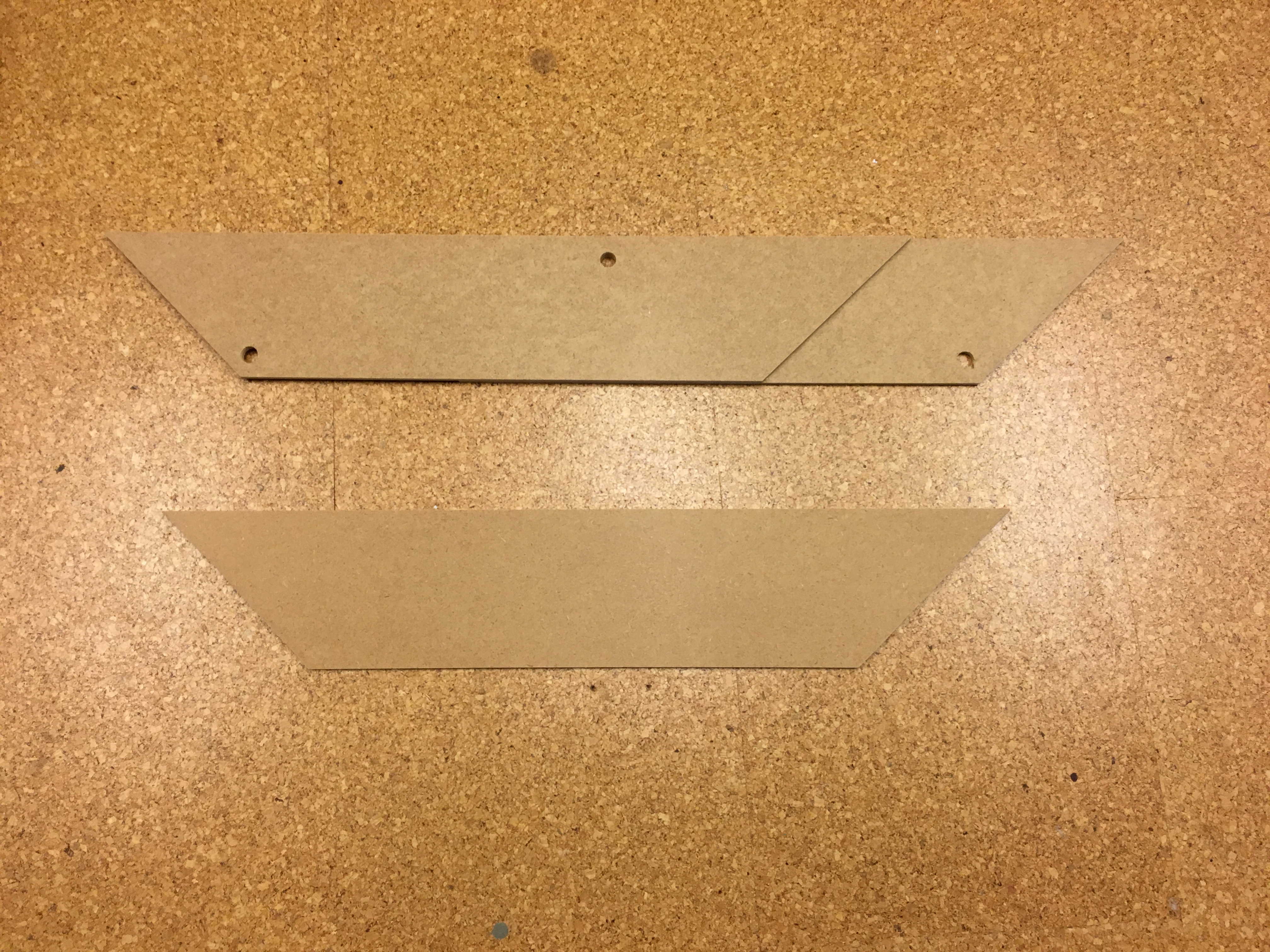 Auf dem Bild unten ist ein Rohling für die Gleiswendel gem. der Skizze zu sehen. Ich habe die Zuschnitte so zueinander versetzt aufgeleimt, dass sie sich auf dem letzten Trassenbrett auflegen. Zu erkennen sind hier auch die Bohrungen für die Gewindestangen. An den Außenecken habe ich eine gesetzt und auf der Mitte der Innenseite - dort ist der Abstand zum Gleis am größten.