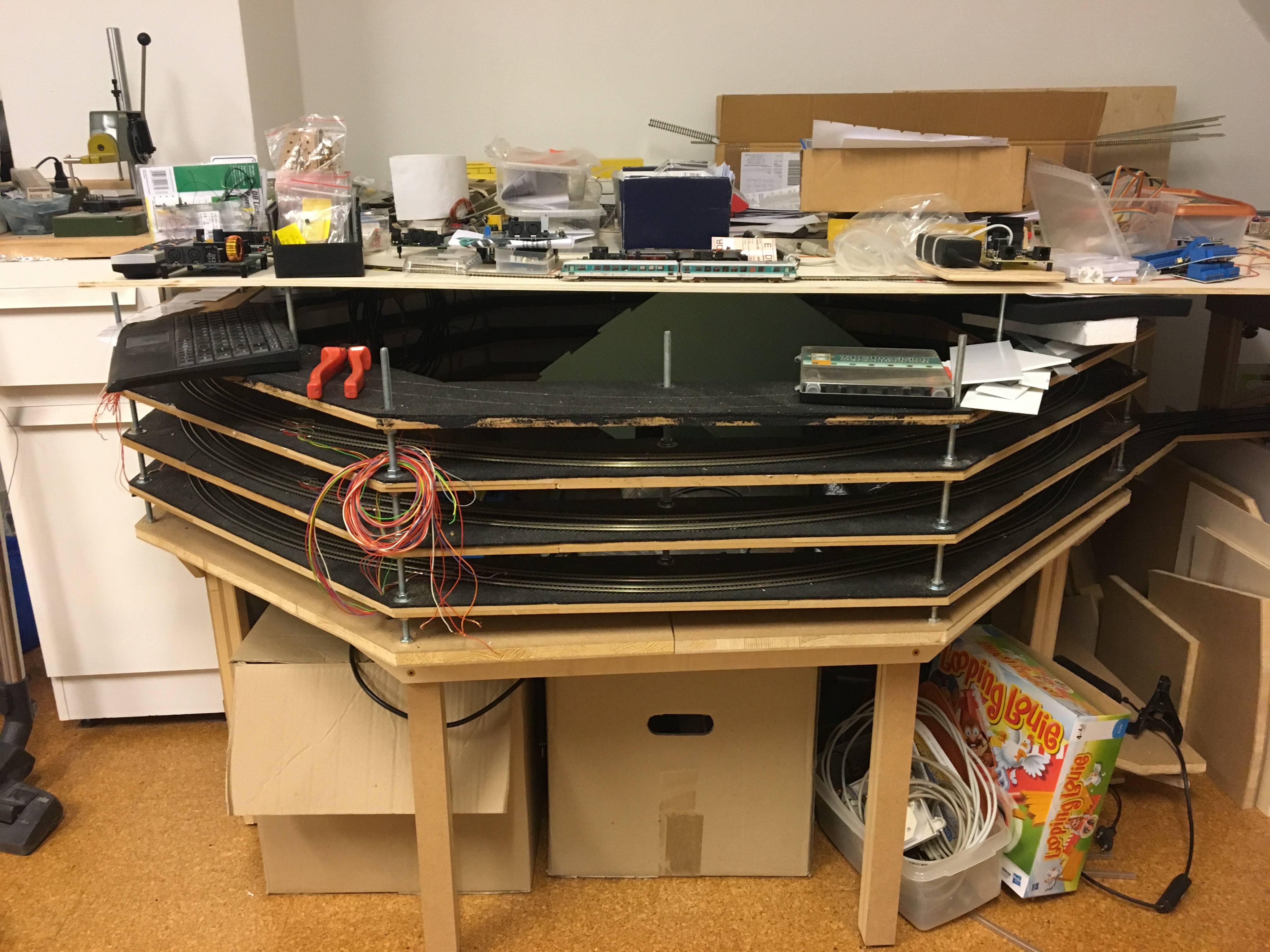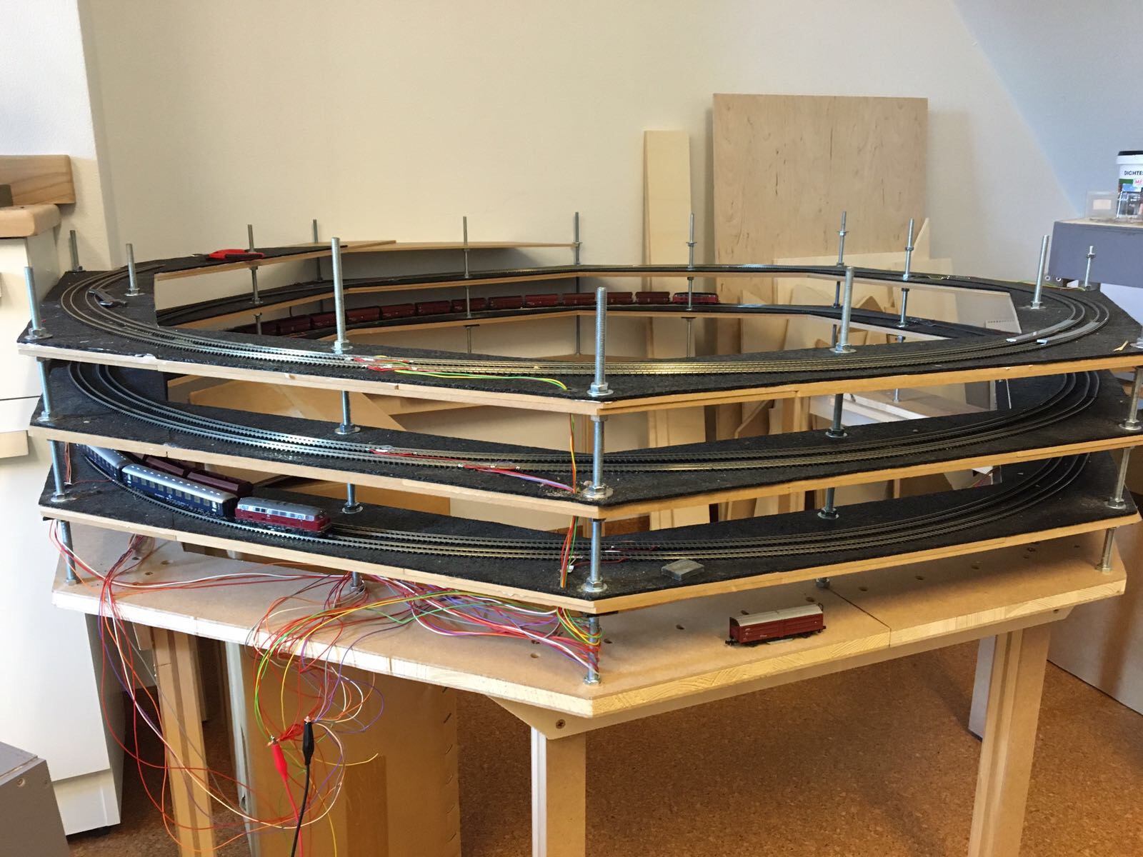 In diesem Augenblick war ich froh, dass ich die Höhe der Trassenbretter mit Gewindestangen einstellen konnte. Ich habe hin und her gerechnet, um eine weitere Umdrehung auf der Wendel zu erhalten aber dabei auch nicht den Abstand der Ebenen untereinander zu eng zu machen.