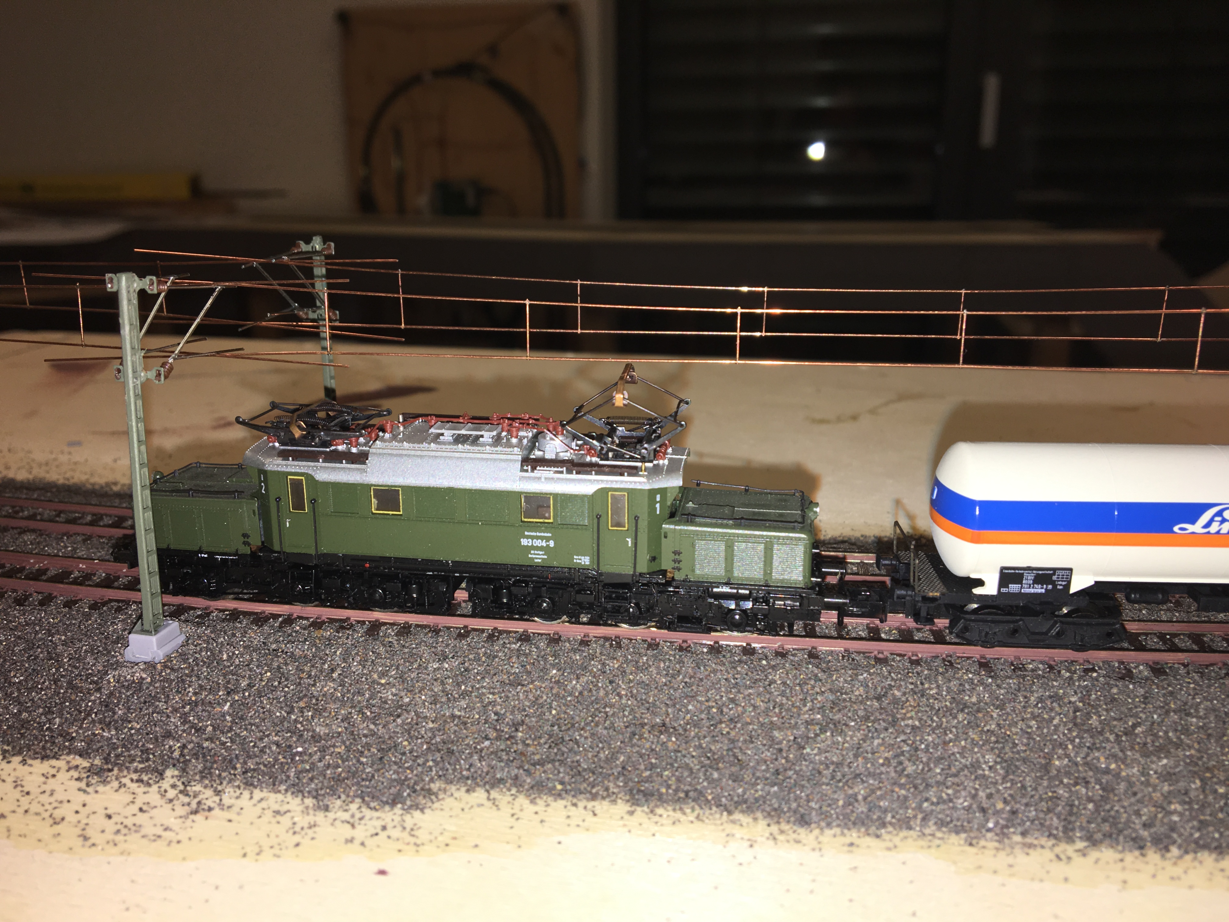 Ein defekter Rungenwagen dient hier als Einstelllehre für den Fahrdraht
