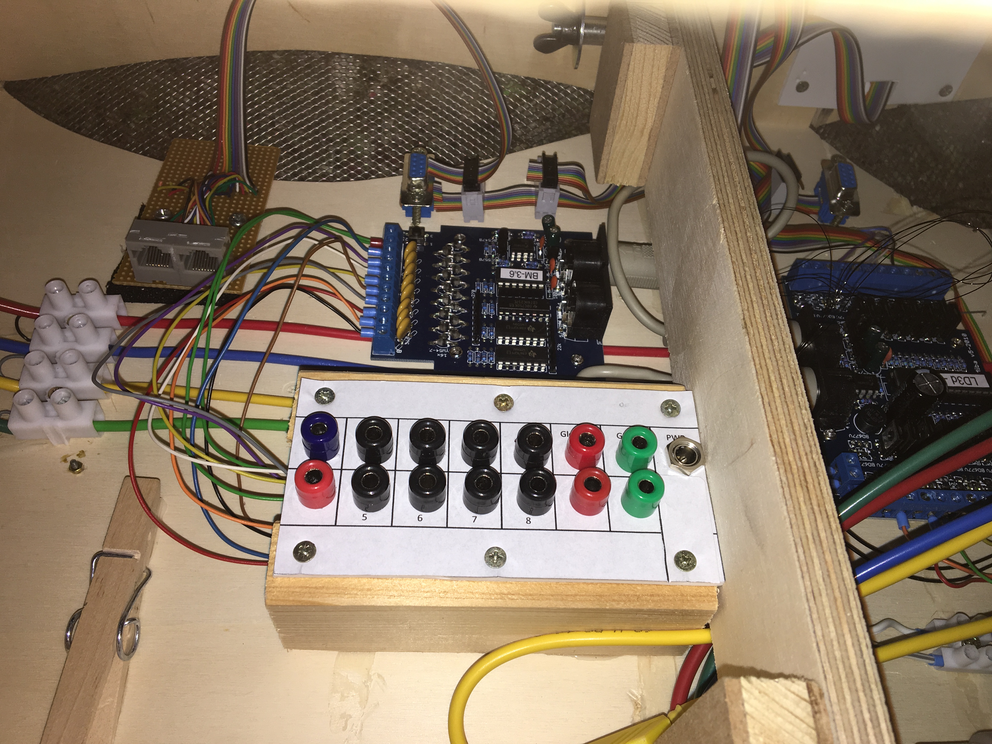 Hier sind es: Interface zum erzeugen eines SX-Bus, ein Taster-Eingabe-Modul an dem die Belegtmelder (FREMO-Sensoren) die Belegterkennung machen, ein LED-Ausgangs-Modul, an dem die Signale angeschlossen werden. Die vielen Stöpselbuchsen sind dafür gedacht, dass man verschiedene angrenzende "fremde" Module ebenfalls mit der Belegtmeldung erfassen könnte und damit den Streckenblock zu steuern - da lege ich mir jedes Mal die Karten, bis ich das richtig gestöpselt habe, dass das richtige Signal gesteuert wird, ich muß das besser Dokumentieren ...