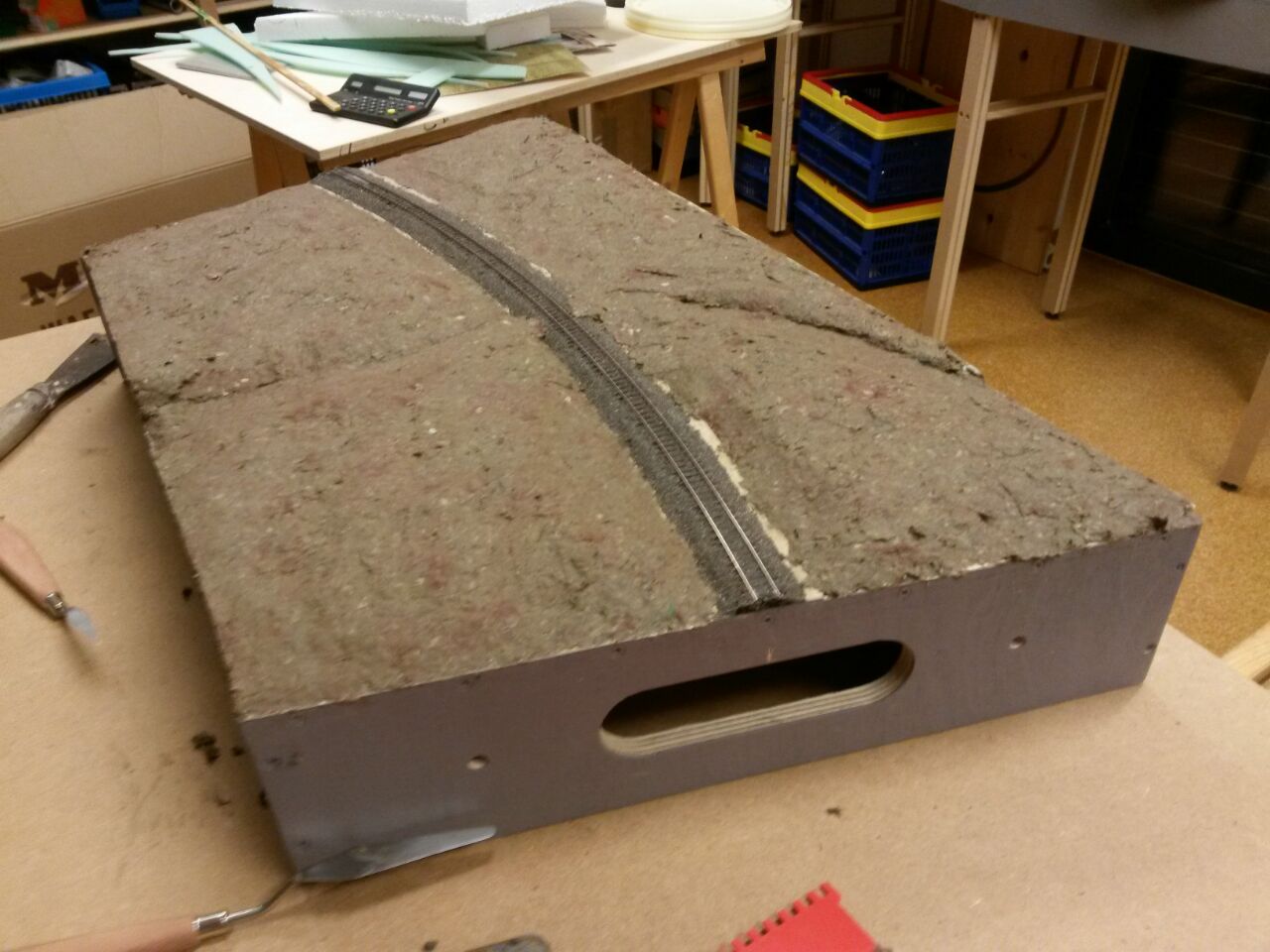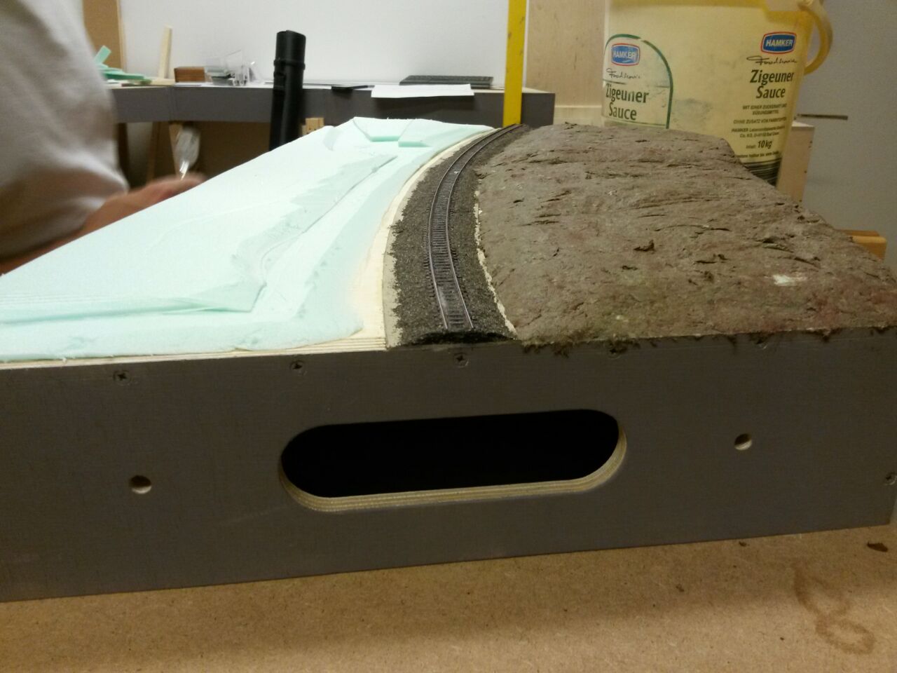 Den Modulkasten haben wir schnell zusammengesetzt, das Gleis war dan der Gleis-Schablone schnell verlegt, die Gestaltung konnte also bald beginnen. Hier ist zu erkennen, dass die Platte mit dem Gleis an der Oberkante des Modul angesetzt sind. Mit dem zweiten Stammtisch-Modul haben wir diese Platte etwas tiefer eingesetzt. Damit besteht dann die Möglichkeit, die Topografie des Gelände auch tiefer als den Modulrahmen zu gestalten. Sonst kann es passieren, das es dann später im Arrangement mit anderen Modulen eine Wellenform ergibt, wenn andere Module auch nur nach oben in ihrer Topografie gehen. An den Modulübergängen ist dann ja immer wieder die gleiche Höhe.