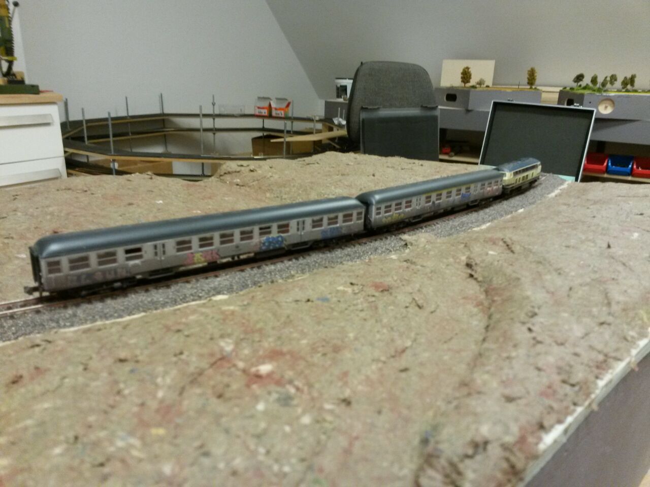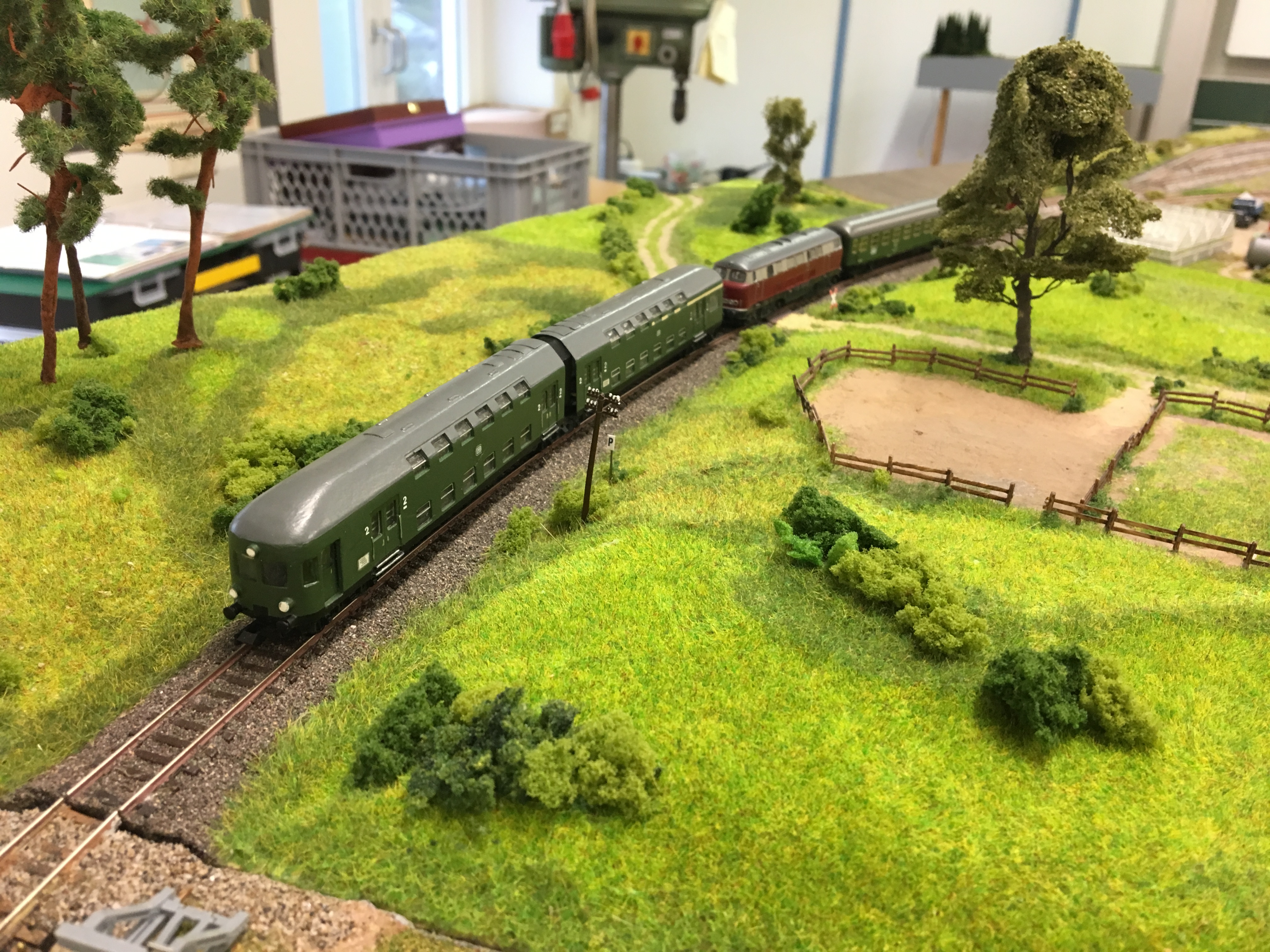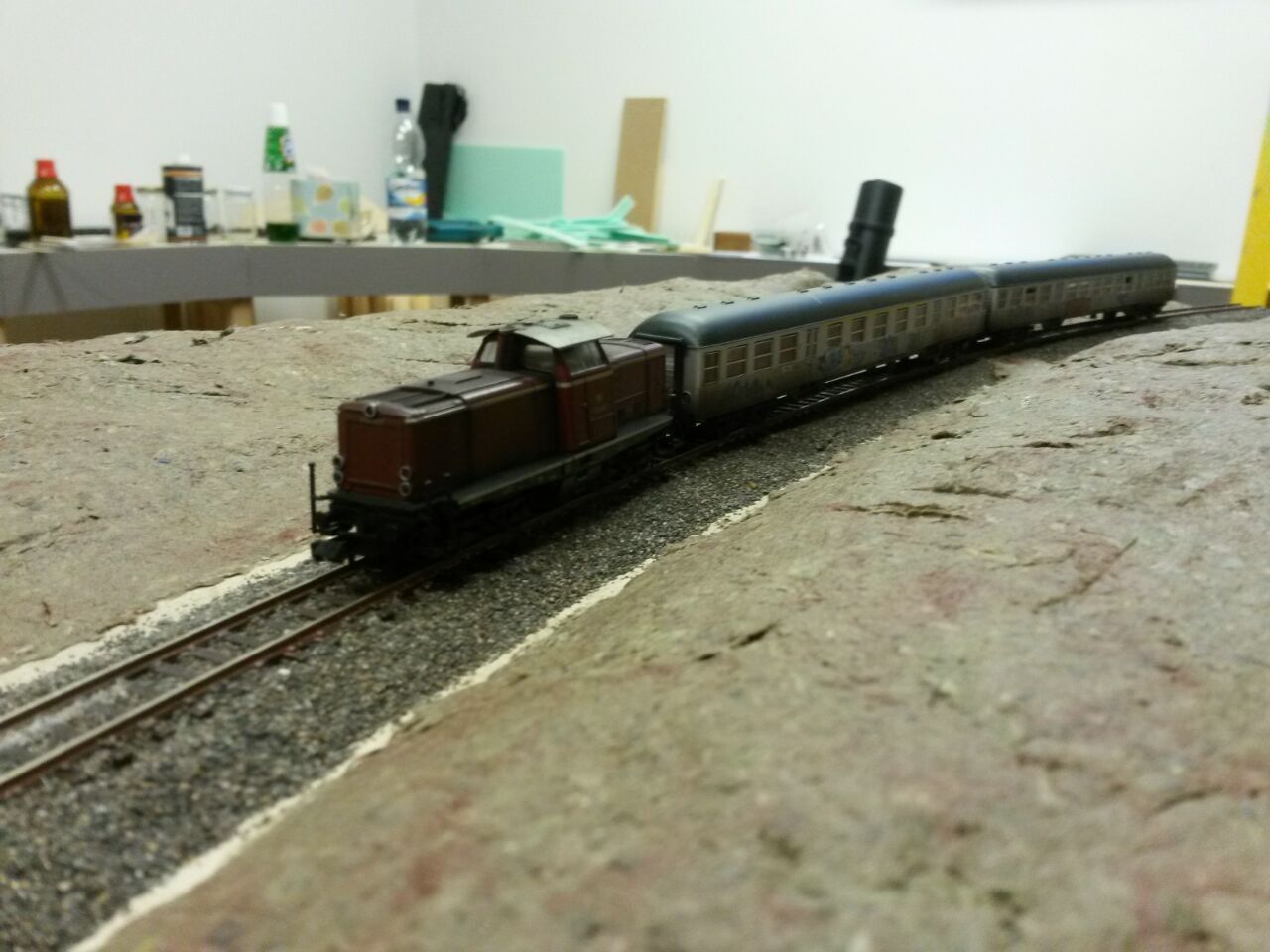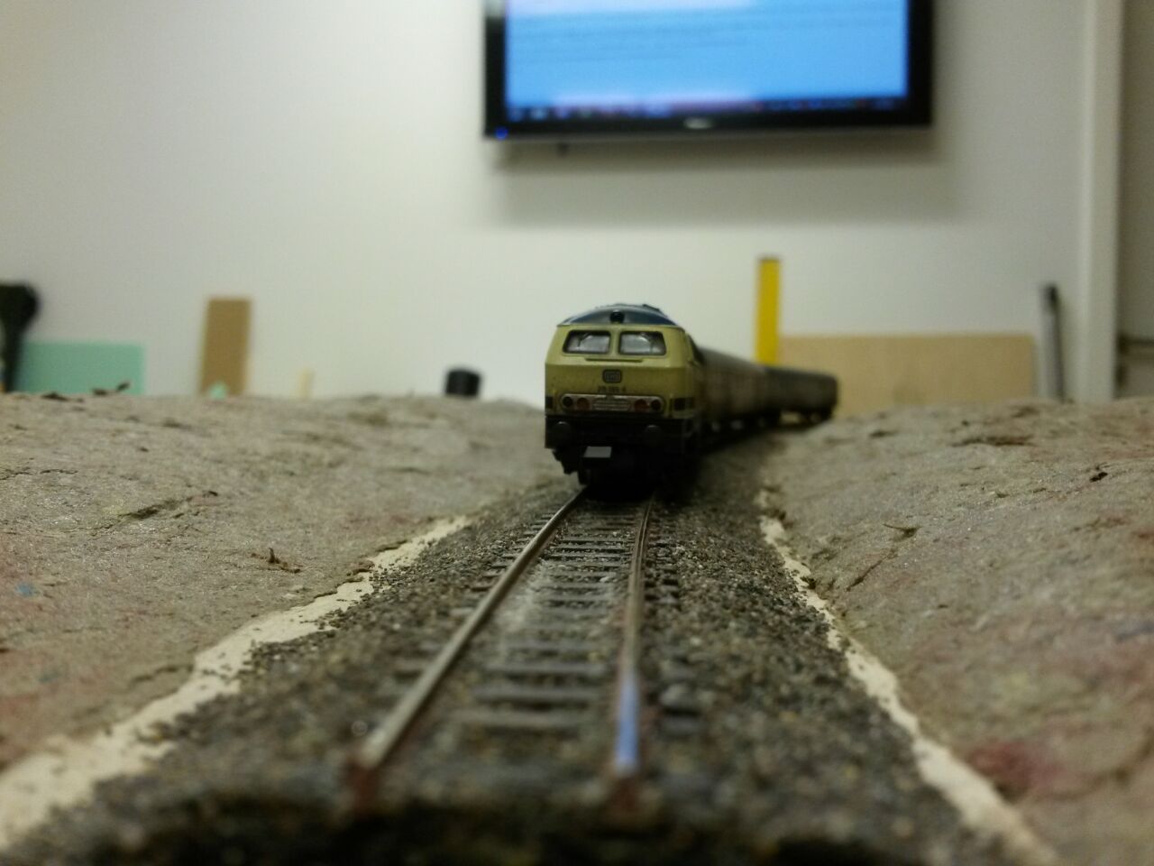 Hier ist schon Schotter am Gleis, erste Stellproben mit verschiedenen Fahrzeugen …
