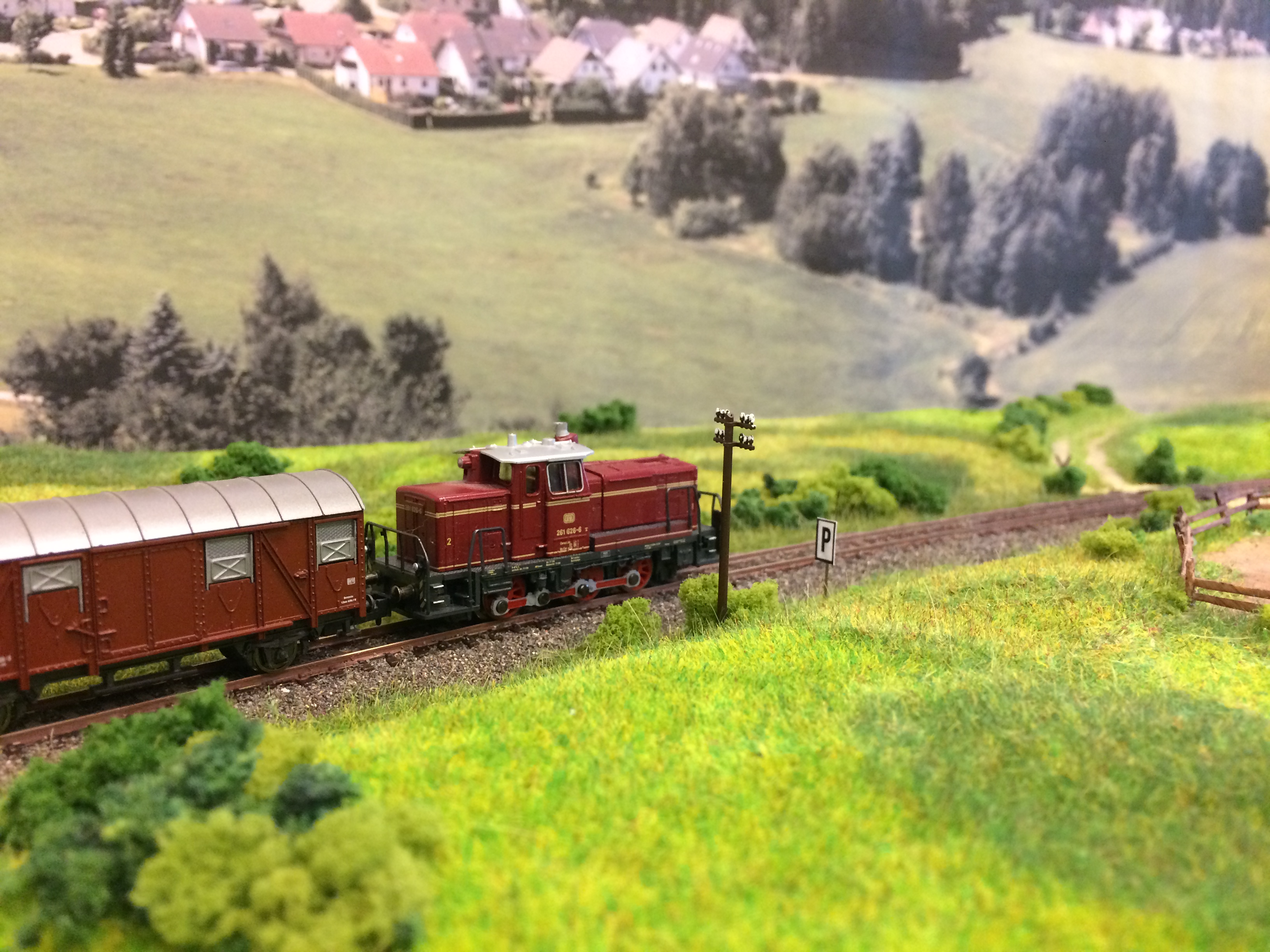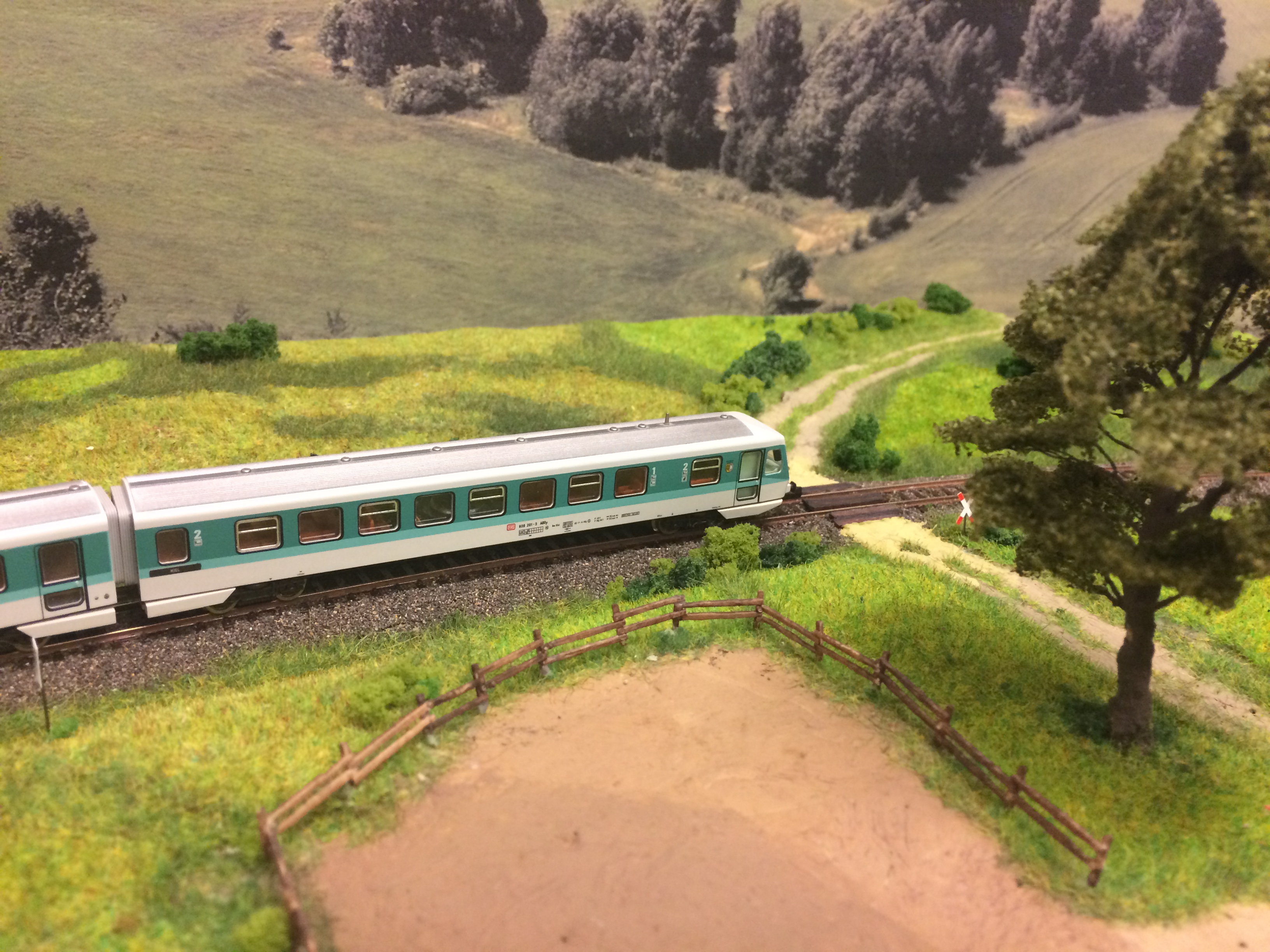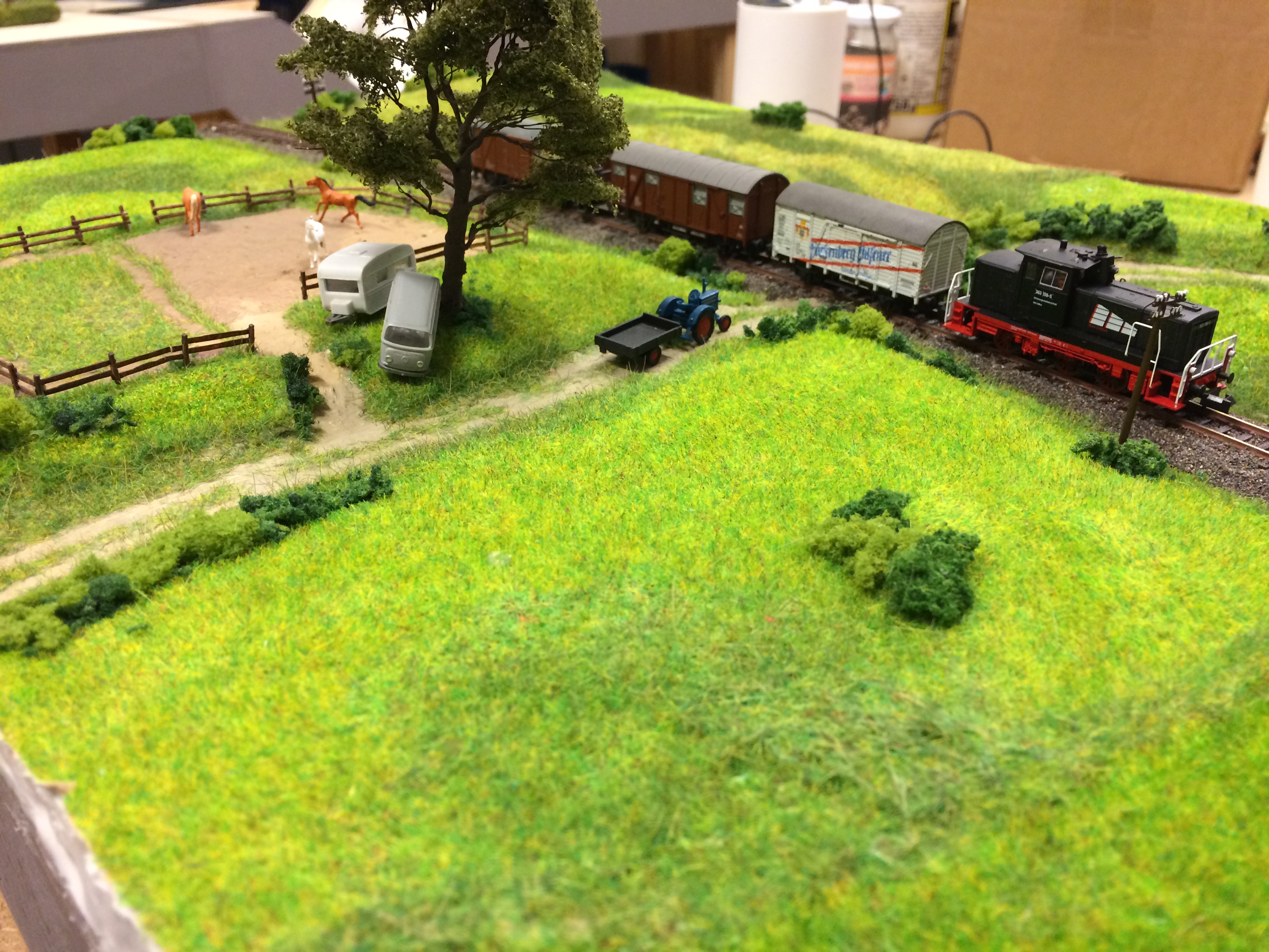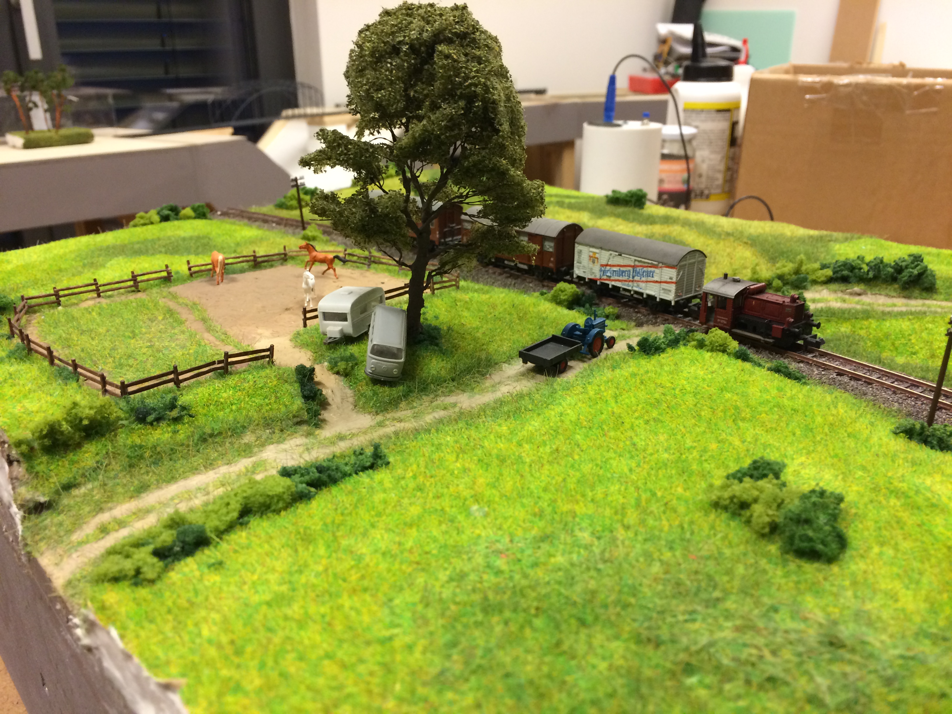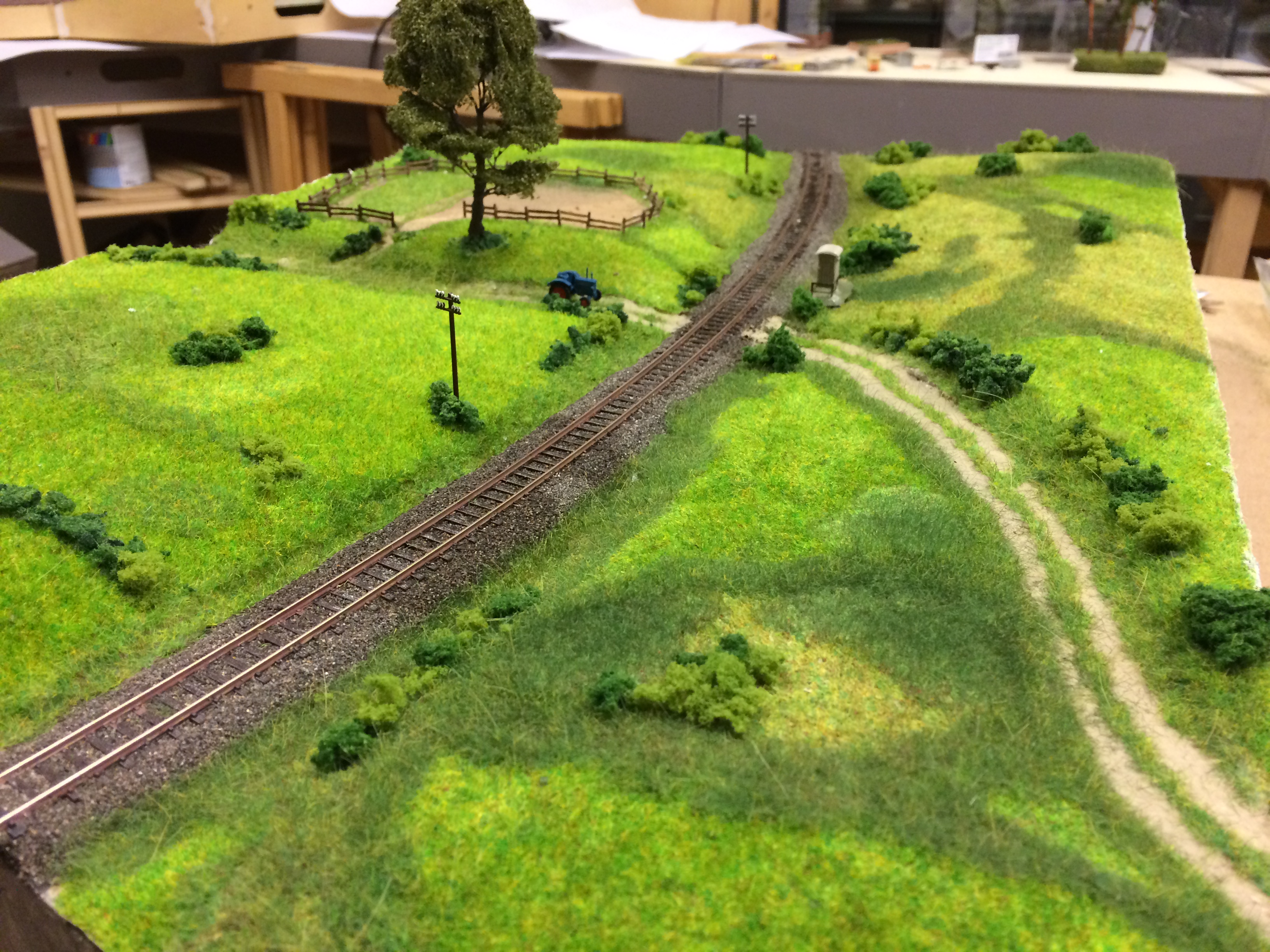 Hier ist schon Schotter am Gleis, erste Stellproben mit verschiedenen Fahrzeugen …